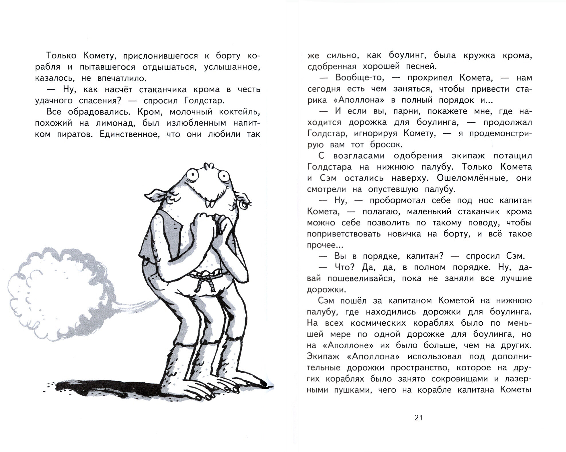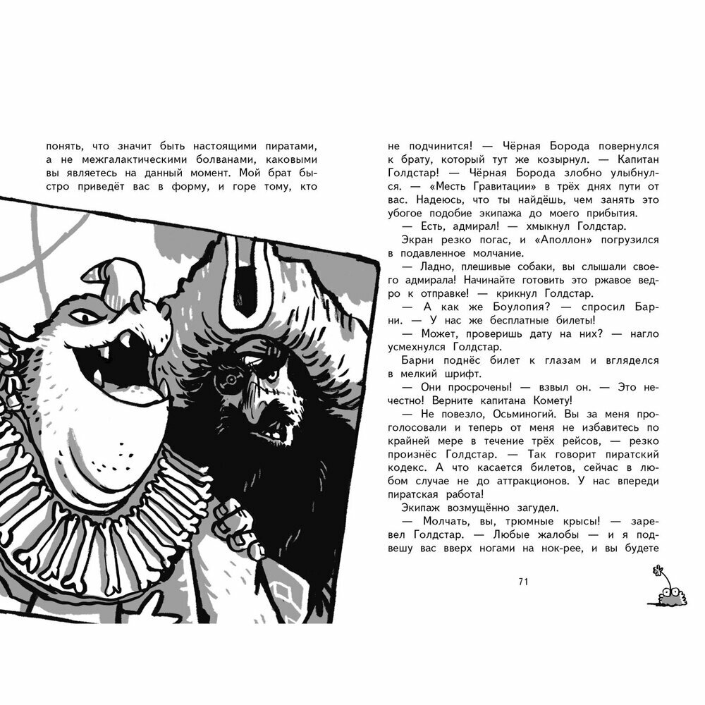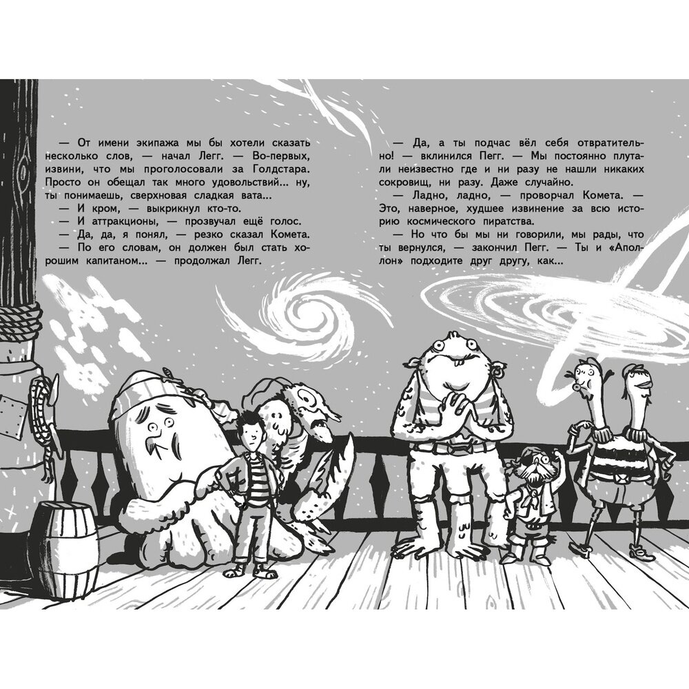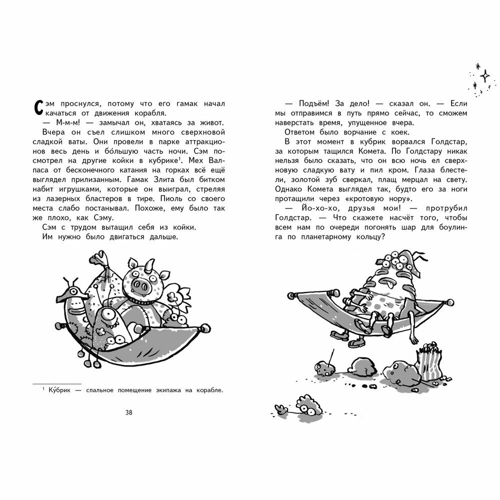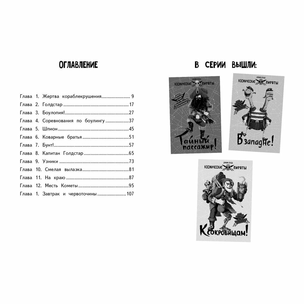 Замечательная книга, 3-я из серии, то что нужно для мальчишки 5 - 9 лет: космические приключения, пираты, сокровища и главный герой мальчик, который окажется смелее и находчивее пиратов. Читали с удовольствием, сюжет динамичен, иллюстрации с юмором, хоть и черно-белые. Хотя каждая книга - это законченный сюжет, лучше начать с 1й.