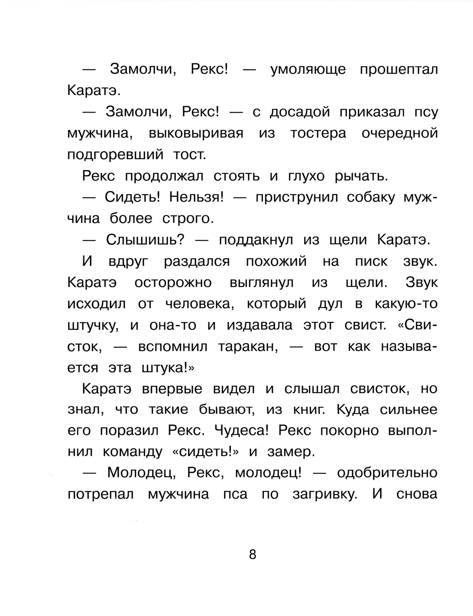 На этот раз таракан Каратэ, блоха Скок и вошь Лиана будут охотиться за… свистком! «Зачем им свисток?», - спросите вы. Все дело в том, что свисток оказывает парализующее действие на пса Рекса – главного врага нашей компании. А если враг нейтрализован, то можно вволю лакомиться крошками от тостов и другими вкусностями! Тараканья банда решает во что бы то ни стало завладеть свистком! Но сделать это не так-то просто, ведь Рекс тоже не лыком шит и прекрасно понимает, что задумали букашки. В результате он зовет на помощь аквариумных рыб и отдает свисток под их охрану. Задача наших героев усложняется. Удастся ли им заполучить желанный свисток? Смогут ли они командовать самим Рексом? Об этом вы узнаете, прочитав книгу.