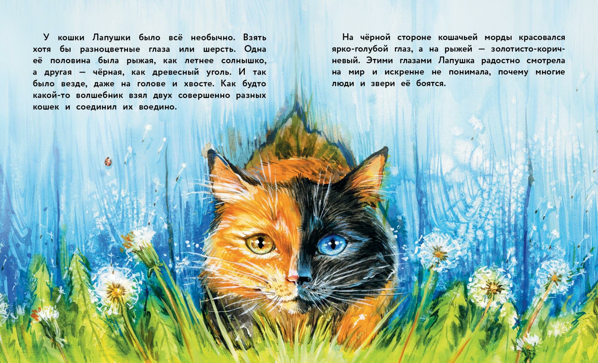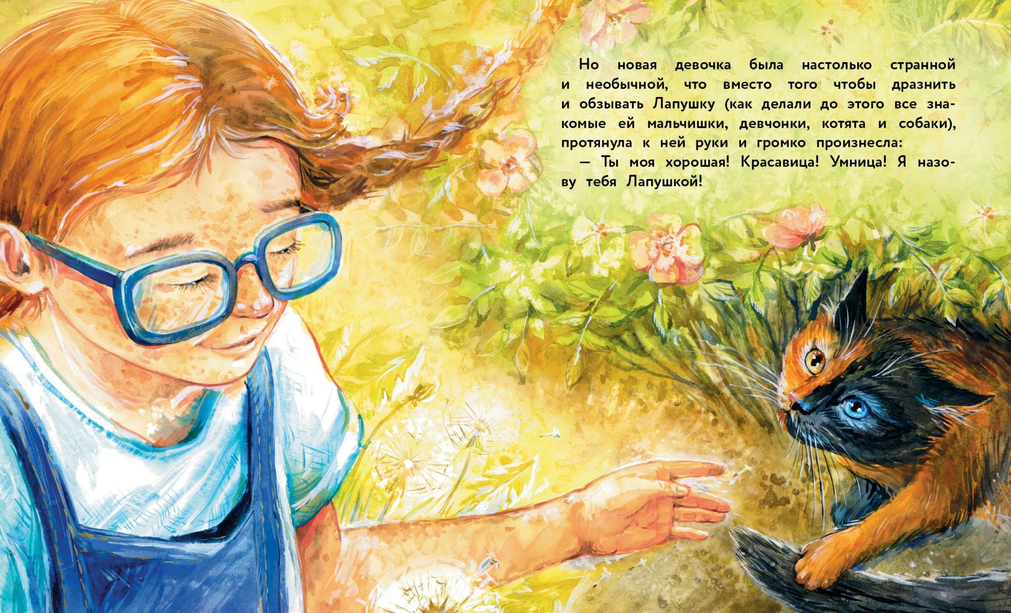 В одной есть кошка Лапушка, не такая как все. Детки с ней не играют, не гладят, даже собаки гонять не хотят. Кошка с разным цветом глаз и необычным окрасом, совершенно удивительная кошка! ( Мы бы с радостью с такой познакомились!), не принимают, стороняться, возможно даже бояться. И, вот девочка высокая, рыженькая в странных очках. Им совершенно точно, удалось найти общий язык, довериться друг другу и стать настоящими друзьями.