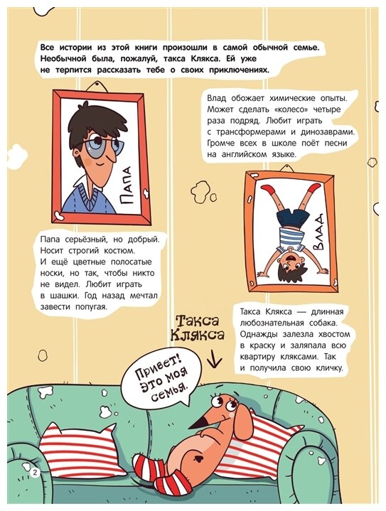 Книга в твердой обложке, формата А4, листы плотные, качество бумаги отличное. Книжка очень забавная, юмористическая, про семью с таксой и ее проделки. Всего десять рассказов - яркие рисунки и к ним немного текста. Дети могут рассматривать картинки и рассказывать что на них происходит. Специально искала комиксы для ребенка 6 лет, думаю подойдет на возраст 4 - 8 лет.