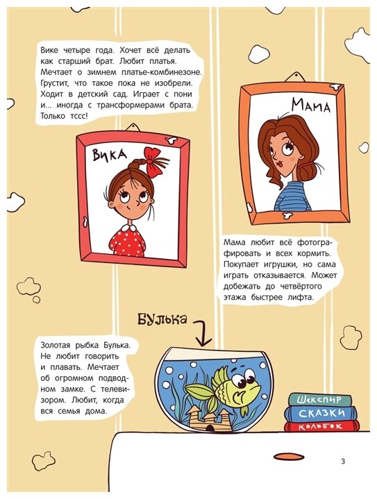 В книге 9 коротких историй: 6 - на один разворот и 3 - на два. Истории простые, текста мало (мне приходилось добавлять немного от себя, чтобы связать картинки).