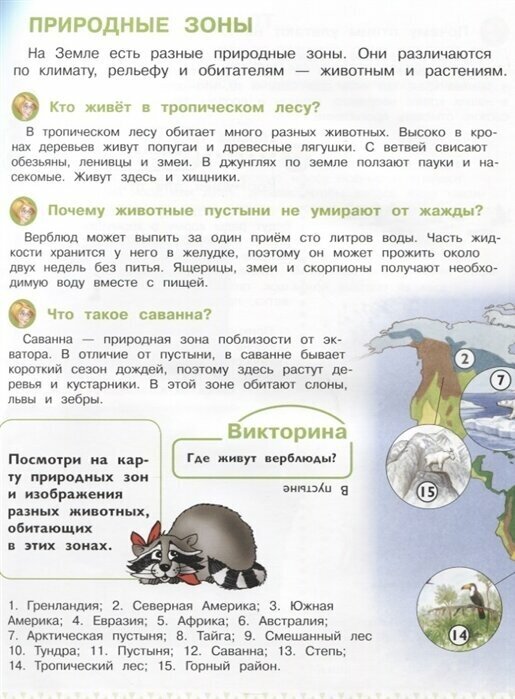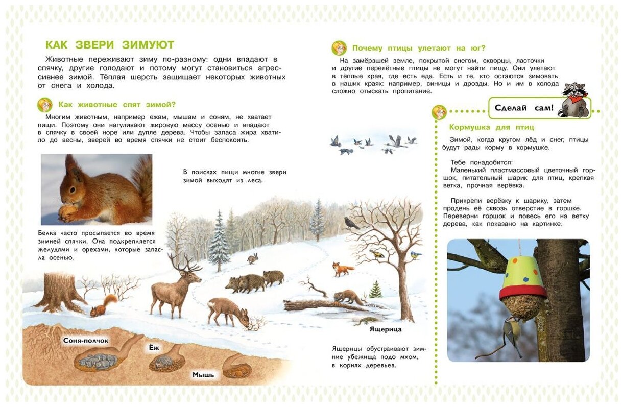 Часть пояснительного текста книги выделена крупным шрифтом, чтобы его смог прочесть сам ребёнок, а весёлый енот, появляющийся на страницах энциклопедии, будет давать небольшие задания и поможет лучше усвоить изложенный материал.