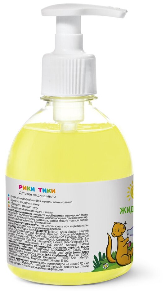 Детское жидкое мыло Клубника-банан "Рики Тики" комплекс натуральных экстрактов, не вызывающих аллергии или других неприятных явлений, оставляющий на личике и ручках малыша свежесть и приятный фруктовый запах. Детям очень нравится мягкая ароматная пена: мытье рук и купание можно превратить в веселую игру, а смех и радость малыша доставит массу удовольствия родителям!