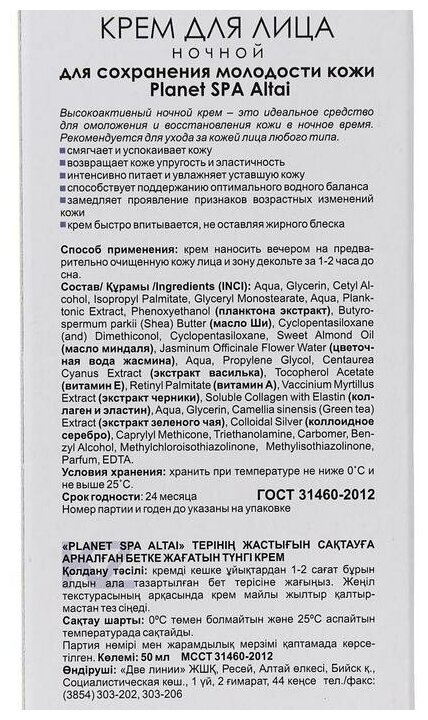Крем для лица ночной для сохранения молодости кожи planet spa altai 50мл Две линии ПКФ ООО (487557)