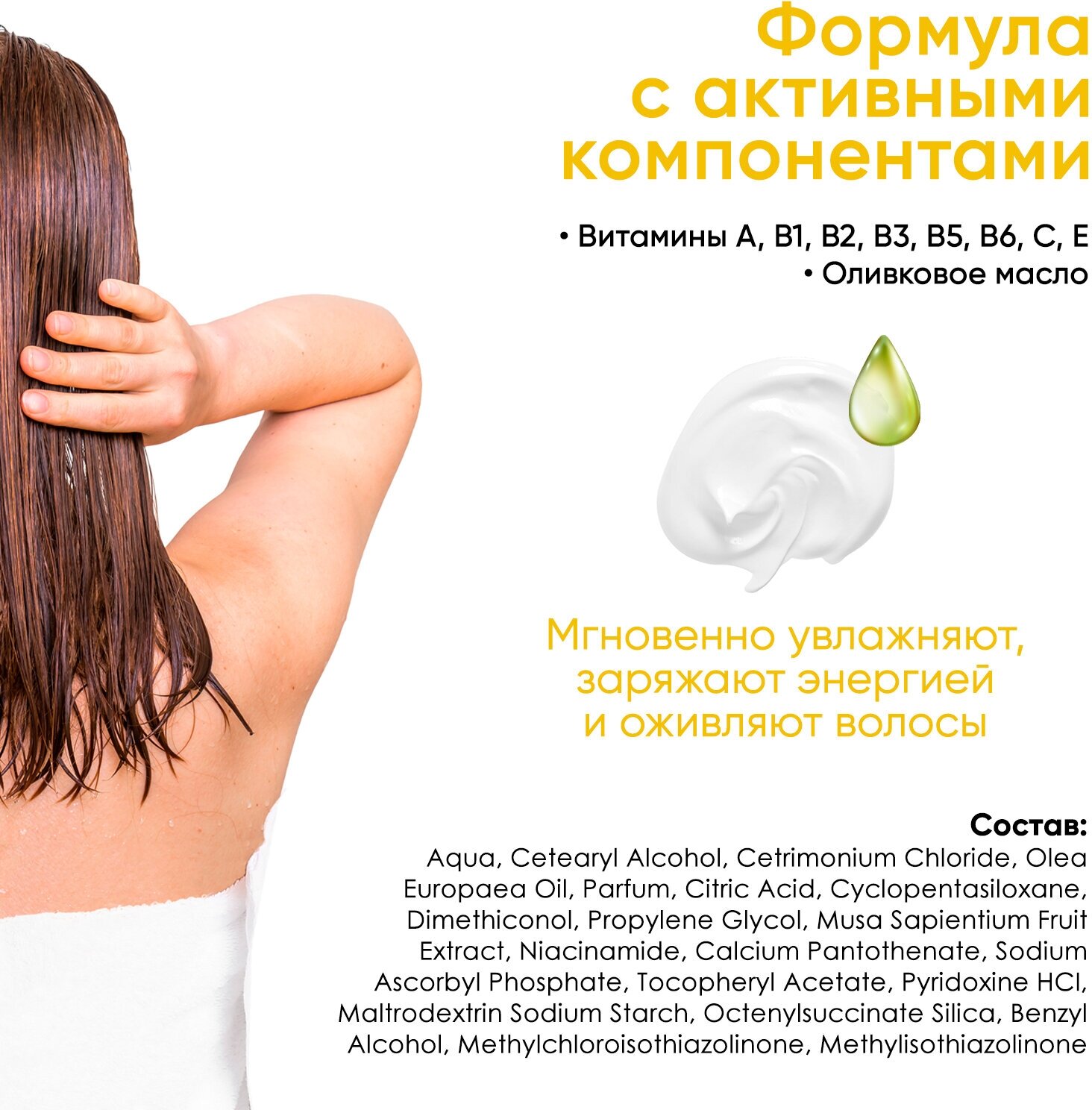 | Состав | Aqua, Cetearyl Alcohol, Cetrimonium Chloride, Olea Europaea Oil, Parfum, Citric Acid, Cyclopentasiloxane, Dimethiconol, Propylene Glycol, Musa Sapientium Fruit Extract, Niacinamide, Calcium Pantothenate, Sodium Ascorbyl Phosphate, Tocopheryl Acetate, Pyridoxine HCI, Maltrodextrin Sodium Starch, Octenylsuccinate Silica, Benzyl Alcohol, Methylchloroisothiazolinone, Methylisothiazolinone |
