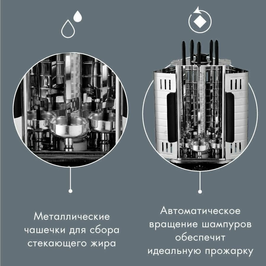 | Дополнительная информация | скорость вращения шампуров 4 об/мин, время приготовления 14 мин, автоматическое вращение шампуров, ненагревающиеся ручки, быстрое приготовление, легкая очистка |