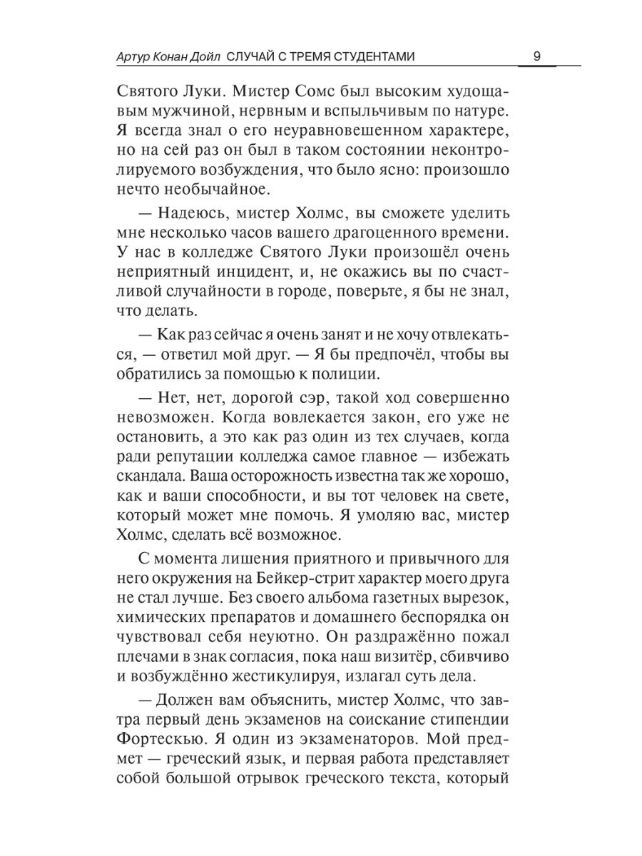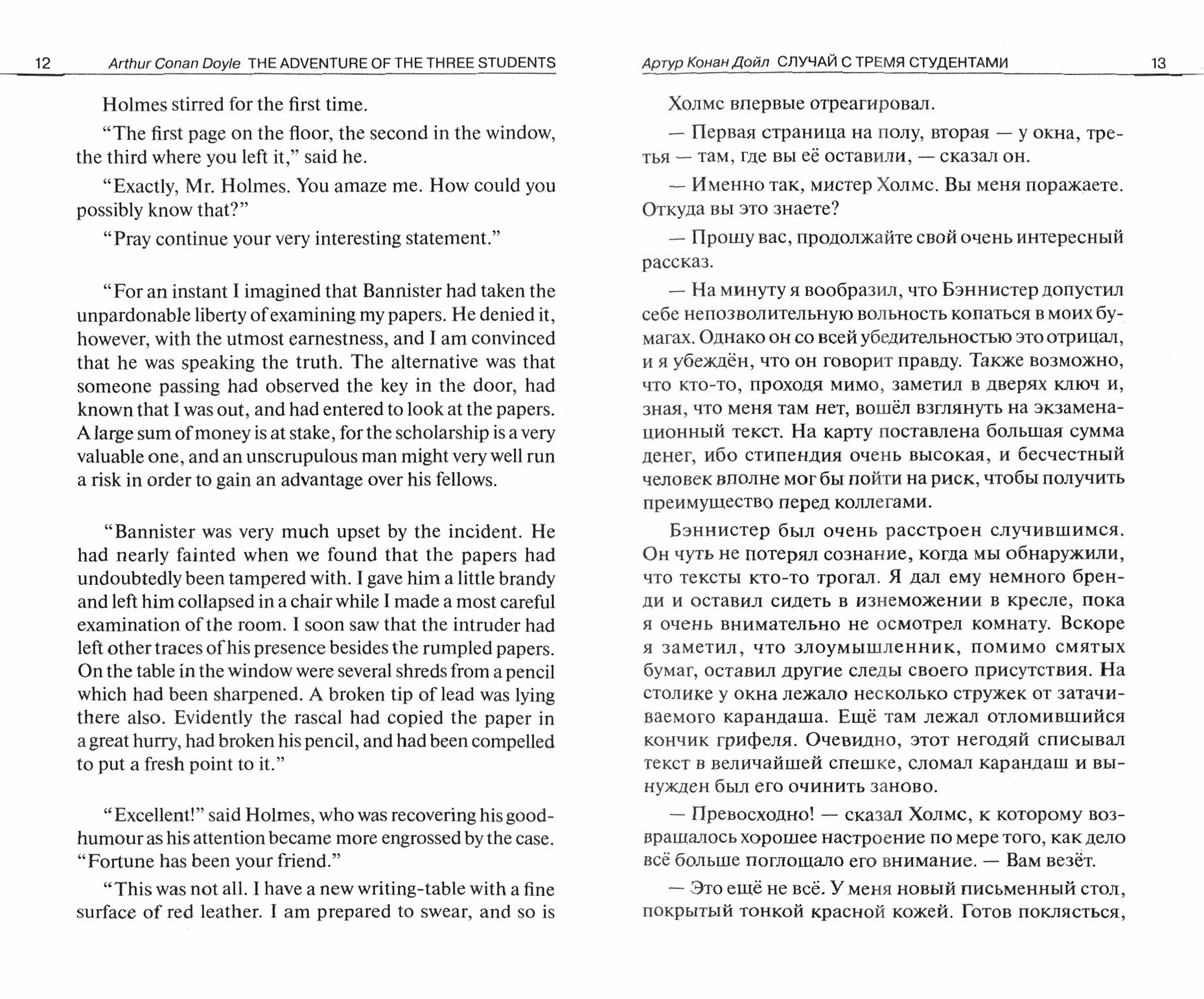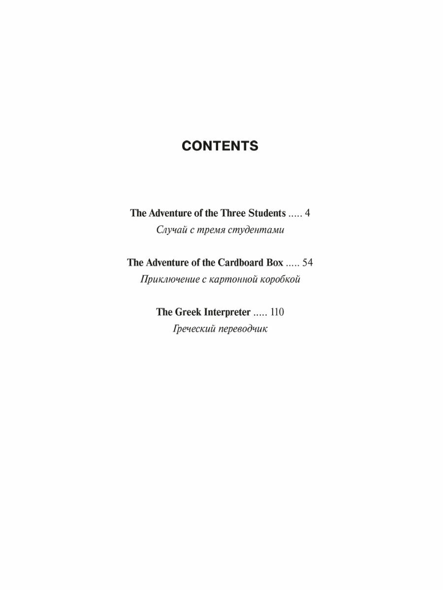 Книга организована по принципу билингвы: произведения опубликованы на языке оригинала с параллельным переводом на русский язык. Три новеллы о приключениях Шерлока Холмса дарят новую встречу со знаменитым частным детективом, его другом доктором Уотсоном и пронырливым лондонским полицейским Лестрейдом. Холмсу интересно всё: от незначительной кражи в университете до изощрённо-варварского похищения и убийства. Каким бы ни был мотив преступления — месть, корысть или несчастная любовь, оно будет раскрыто. И в этом решающую роль сыграют острый ум, наблюдательность и прославленный дедуктивный метод Шерлока Холмса. Изучение иностранного языка методом параллельного чтения помогает не только расширять словарный запас, но и эффективно работать над усвоением грамматических конструкций и речевых оборотов.