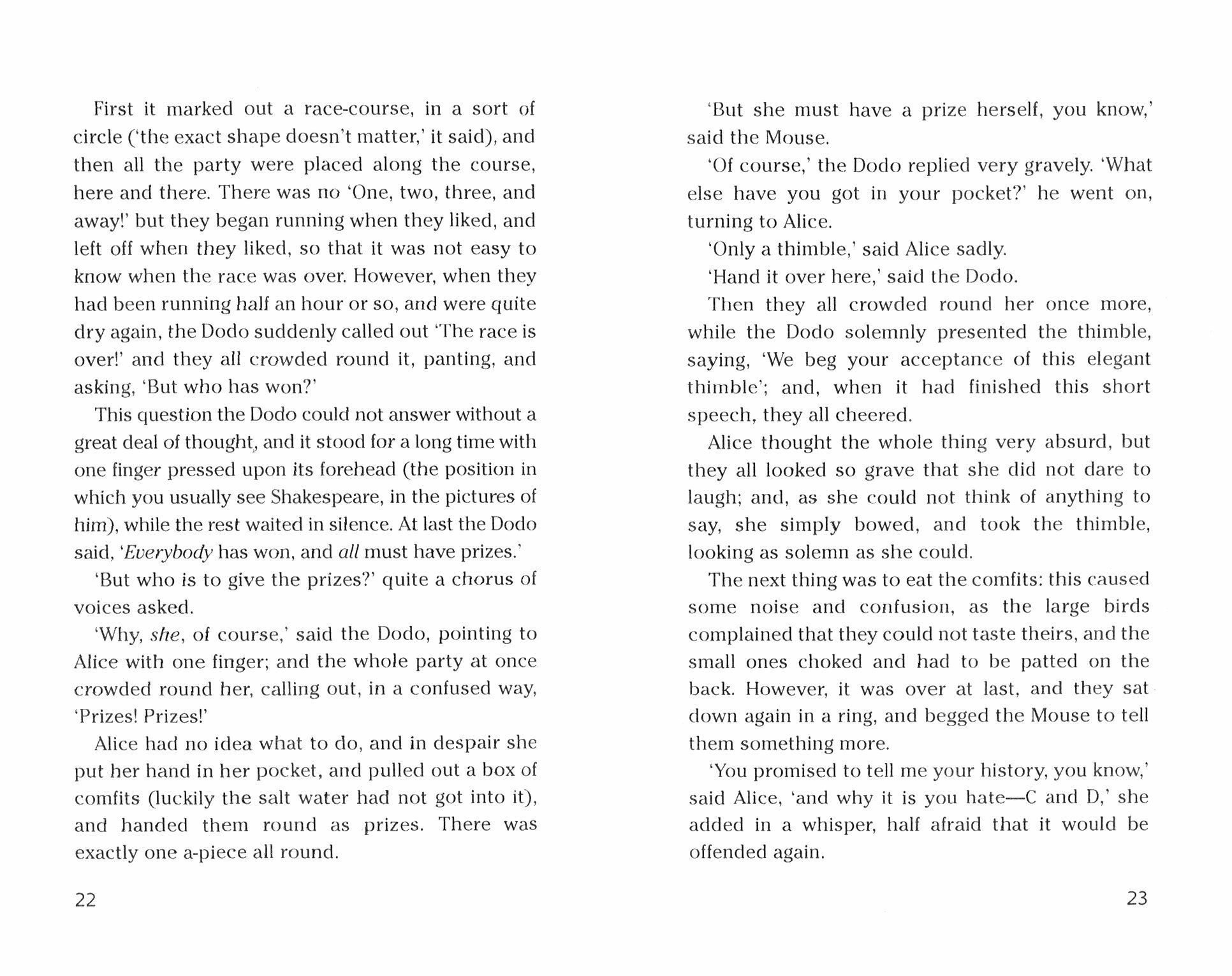 На протяжении десятилетий я считала, что раз уж я могу напевать песню Jefferson Airplane «White Rabbit», то мне не обязательно читать эту книгу. Но когда все же решилась, то была рада, хоть так и не смогла найти, где мышь Соня сказала «Feed your head». В основном Соня просто спала. Эта книга очень-очень странная, даже спустя почти 160 лет, после боулеризации Диснеем и после присвоения хиппи. Хорошая книга, приятно было увидеть в ней одно из моих любимых стихотворений, прочитанное Шляпником: