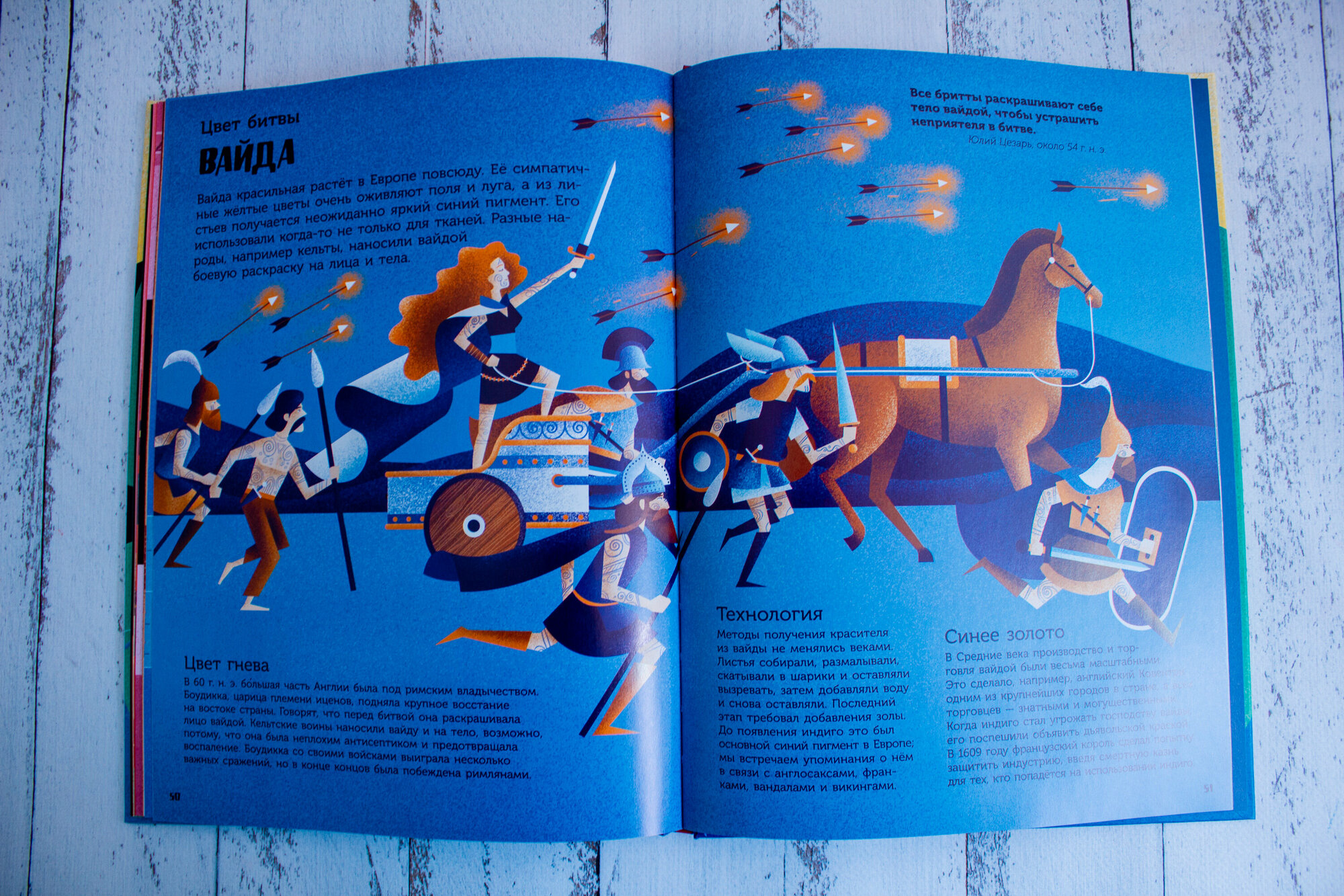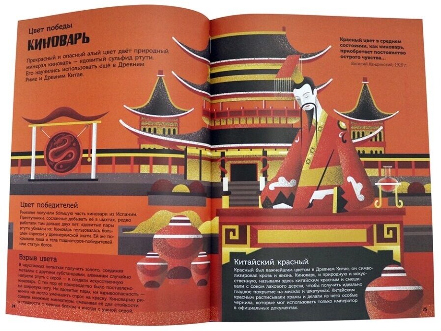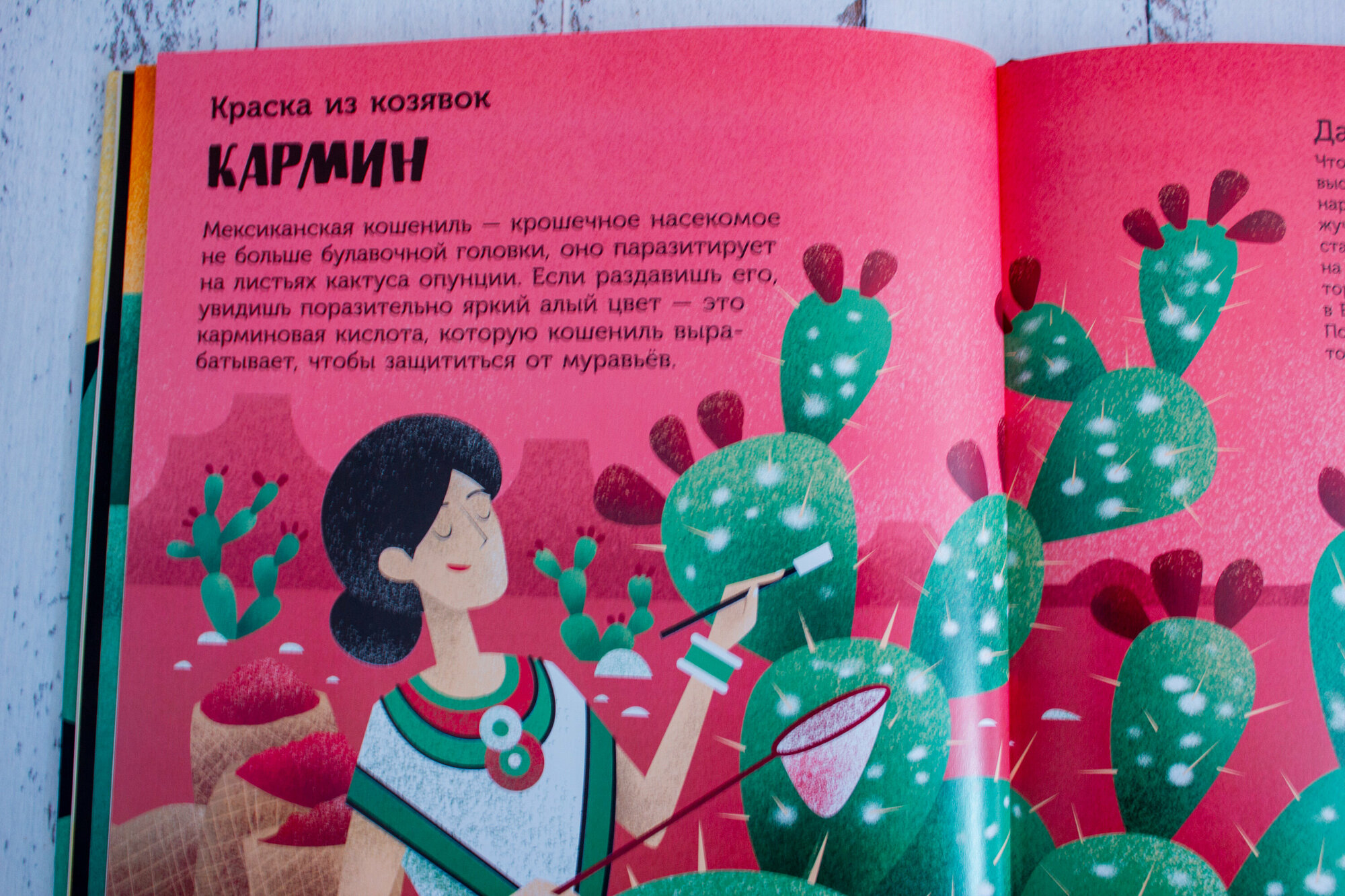 По существу. С этой книгой мы пройдемся по всему спектру и по разным оттенкам одного и того же. Каждый разворот посвящен тому или иному оттенку. Можно узнать, как его получали в древности (измельчали минералы, например, или пользовались соком растений, или делали из насекомых, моллюсков, мумий...), где применяли, как использовали. Какой краской рисовал Ван Гог, почему розовый считался "мужским" цветом в XIX веке, какой цвет мог убить Наполеона - отсылок к истории тоже множество. И про черный и белый тоже не забыли, хотя оттенков у них и нет. :)