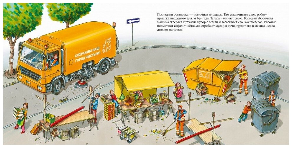 Петер работает водителем мусоровоза. Он встаёт рано утром, чтобы успеть вывезти мусор из жилых кварталов, с центральных площадей и улиц. У Петера есть помощники: поливальные машины, маленькие подметальные машинки, лопаты и мётлы. Ты тоже сможешь помочь Петеру, если научишься сортировать отходы и выбрасывать их в специальные контейнеры.