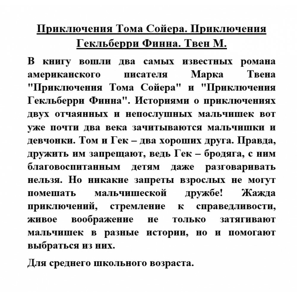 Любимые произведения из детства. Все таки первое произведение (Том Сойер) мне нравится больше. Уникальное!...На события и приключения. Есть все, что возможно сейчас и не хватает современным мальчишкам. Отличный ответ игровым приставкам и прочим электронным гаджетам. Хорошая книга с детскими мечтами, озорством, дружбой, первой любовью. Все, что тревожит и присутствует в этом лучшем возрасте жизни - м а л ь ч и ш к е!