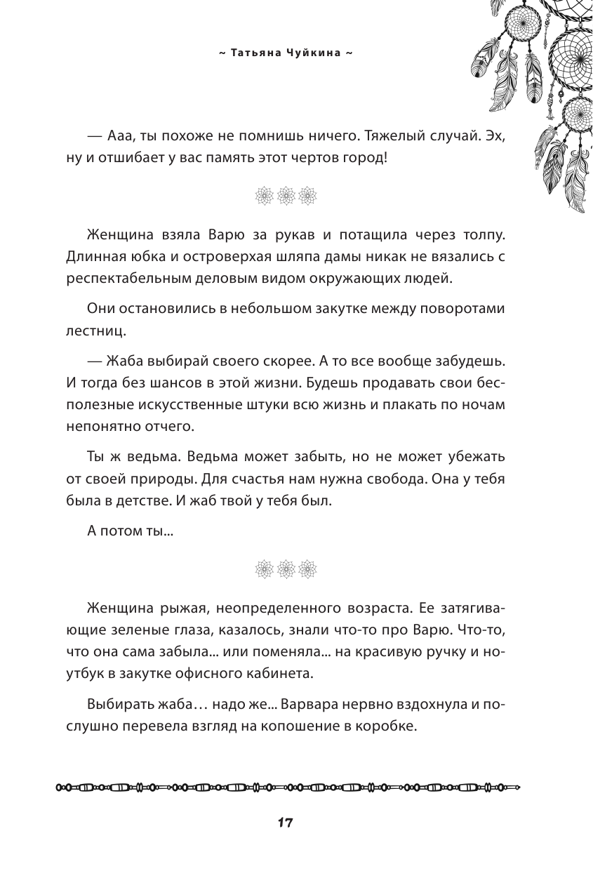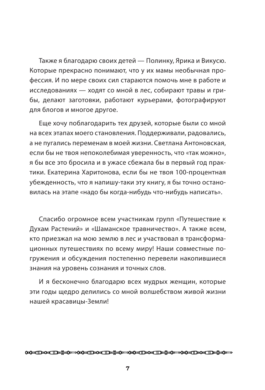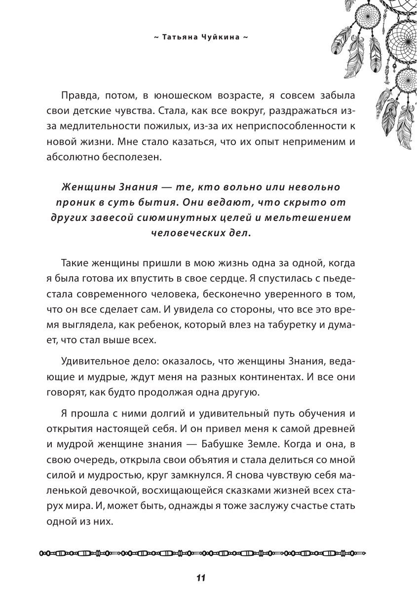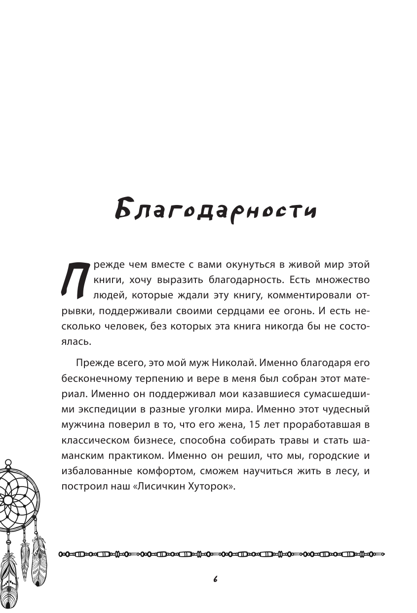 Помогают ли шаманские практики найти себя и решить разного рода проблемы? Никогда не верила в бабушек-травниц. Но книга о том, как начать жить в потоке, проснуться от сна, избавиться от чужого мнения, перестать быть офисным рабом, белкой в колесе со стрессом и бессонными ночами. Автор молодец, что решилась на такие изменения в своей жизни и своим наглядным примером вдохновляет. Книга состоит из двух частей: первая – о женщинах знания, которых встретила Татьяна (и не только в России), а вторая часть содержит непосредственно духовные практики. В общем и увлекательно и полезно. Загуглила – у автора есть сайт и много еще всего интересного,