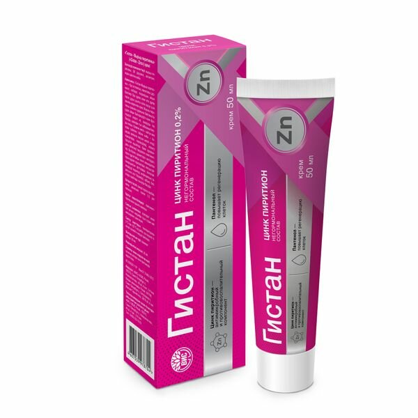 "Гистан - Цинк пиритион" - это специально разработанный крем для правильного бережного ухода за сухой и очень сухой кожей с выраженными признаками атопического, контактного дерматита, себореи, псориаза. Благодаря содержанию в составе крема цинка пиритиона средство обладает выраженным бактерицидным и фунгицидным действием, быстро снимает покраснения, устраняя повышенное шелушение. Основа крема - натуральное масло зародышей пшеницы - способствует регенерации тканей, смягчает, питает, стимулируя процессы заживления. Гармонично подобранные компоненты в составе крема, усиливая свойства друг друга, обеспечивают тщательное смягчение и увлажение поврежденной кожи, повышают регенерацию клеток, ускоряют эпителизацию, препятствуют распространению инфекции, уменьшают симптомы воспаления, снижают зуд. "Цинк Пиритион (водно-дисперсная форма CleanBio TM-Zinc, Корея) нарушает целостность мембран клеток и процессов трансмембранного переноса у бактерий и грибов, поэтому обладает бактерицидным и фунгицидным действием (устраняет причины воспаления).Д-пантенол увлажняет кожу, стимулирует регенерацию кожи, нормализует клеточный метаболизм и увеличивает прочность коллагеновых волокон (ускорение заживления повреждений и трещин)".Показания к применению: "Гистан - Цинк пиритион" - это специально разработанный крем для правильного бережного ухода за сухой и очень сухой кожей с выраженными признаками атопического, контактного дерматита, себореи, псориаза.