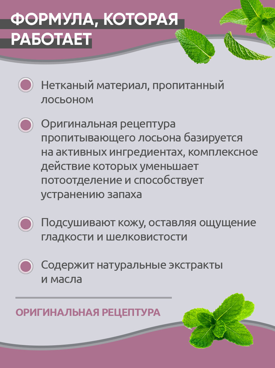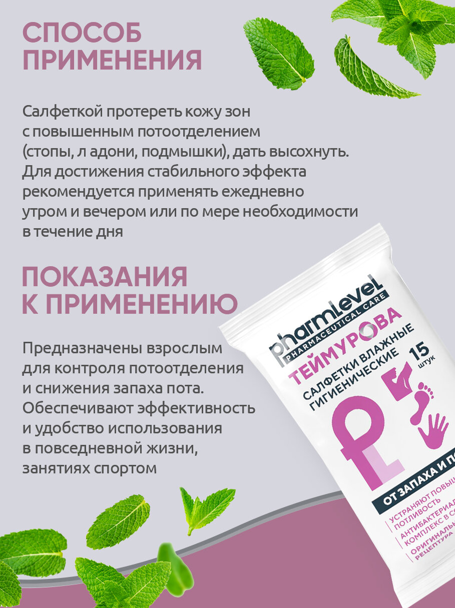 Широко известное средство от запаха и пота теперь и в новом удобном формате - влажные салфетки теймурова! Предназначены взрослым для контроля потоотделения и снижения запаха пота. Обеспечивают эффективность и удобство использования в повседневной жизни в моментах, когда применение других средств невозможно (в поездках, при активном отдыхе, в офисе). Оригинальная рецептура основана на тщательно подобранных активных ингредиентах, комплексное действие которых уменьшает потоотделение и способствует устранению запаха. Содержит натуральные экстракты и масла.