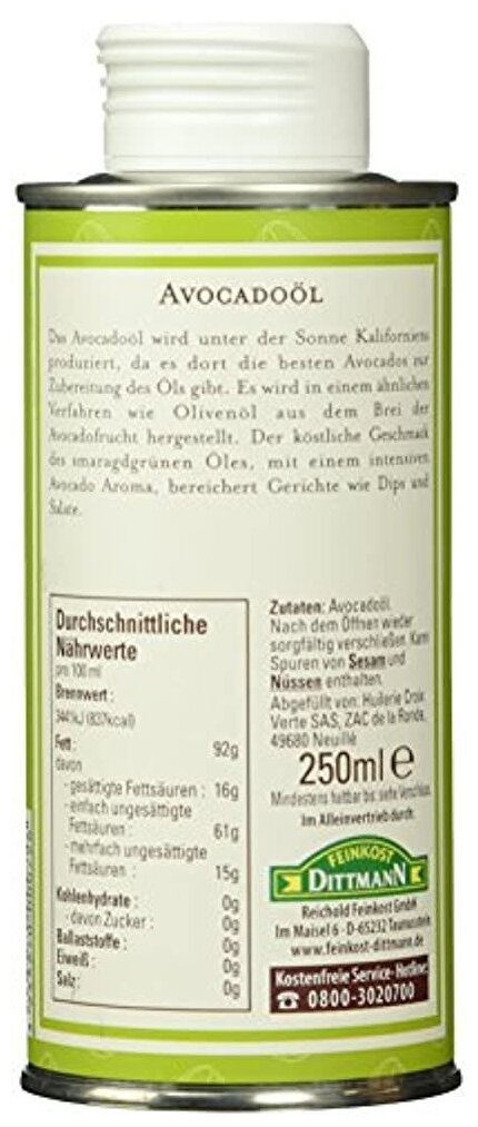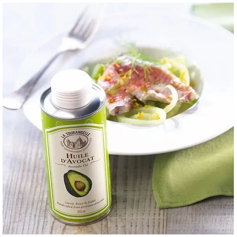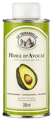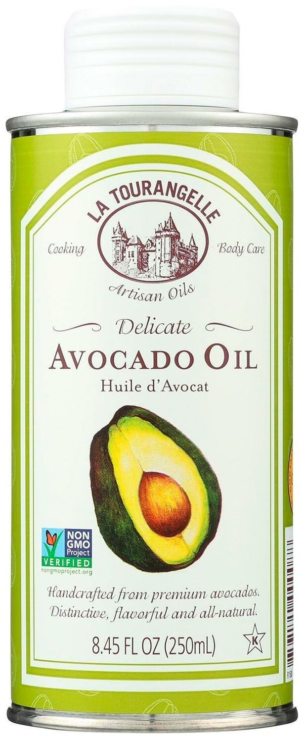 Масло авокадо La Tourangelle (смесь нерафинированного и рафинированного масла авокадо) отжимается шнековым прессом из мякоти авокадо. Оно имеет красивый изумрудно-зеленый цвет и содержит большое количество мононенасыщенных жиров. Имея приятный аромат с фруктовой ноткой, масло придаст вашим любимым блюдам легкий вкус авокадо. Масло авокадо La Tourangelle можно использовать для увлажнения кожи и волос, а также добавлять в косметические средства собственного приготовления. Имеет выразительный вкус и аромат, содержит только натуральные ингредиенты. Подходит для готовки и ухода за телом. Масла с авторскими добавками. В каждой порции содержится в среднем 8 г омега-9. Не содержит натрия. Веганский продукт