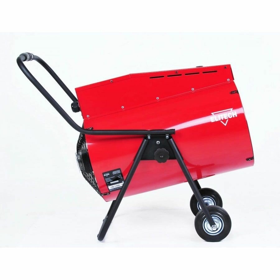 Elitech (Элитеч) это электрическая тепловая пушка, максимальная мощность которой составляет 22 кВт. Модель также может работать в режимах половинной мощности и без нагрева. Она поставляется в сборе с осью с колесами, а также с клеммной колодкой для трехфазного подключения к электрической сети. Корпус круглый.