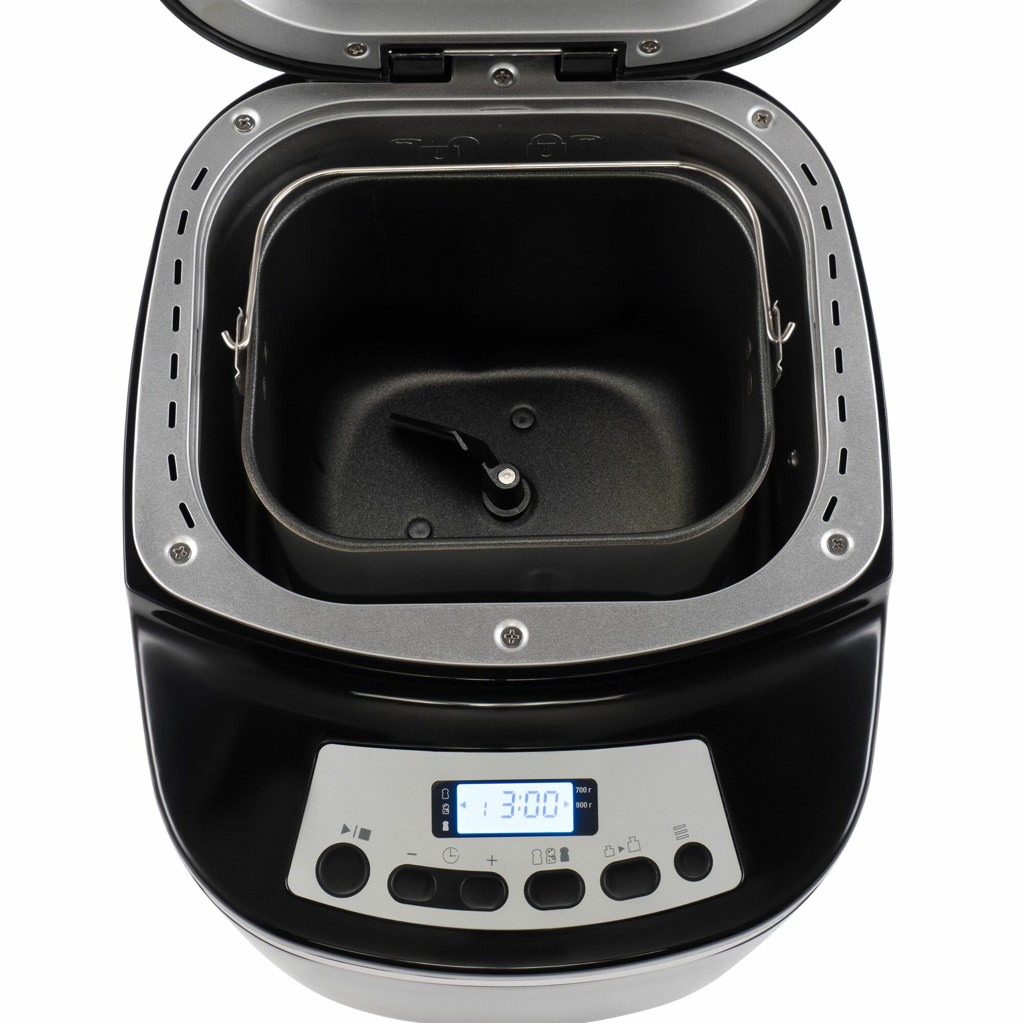 Дисплей предоставляет быстрый доступ ко всем функциям. Вы можете регулировать степень прожарки корочки и вес буханки, а также устанавливать таймер отложенного старта. Прозрачное окно позволяет следить за процессом выпекания.