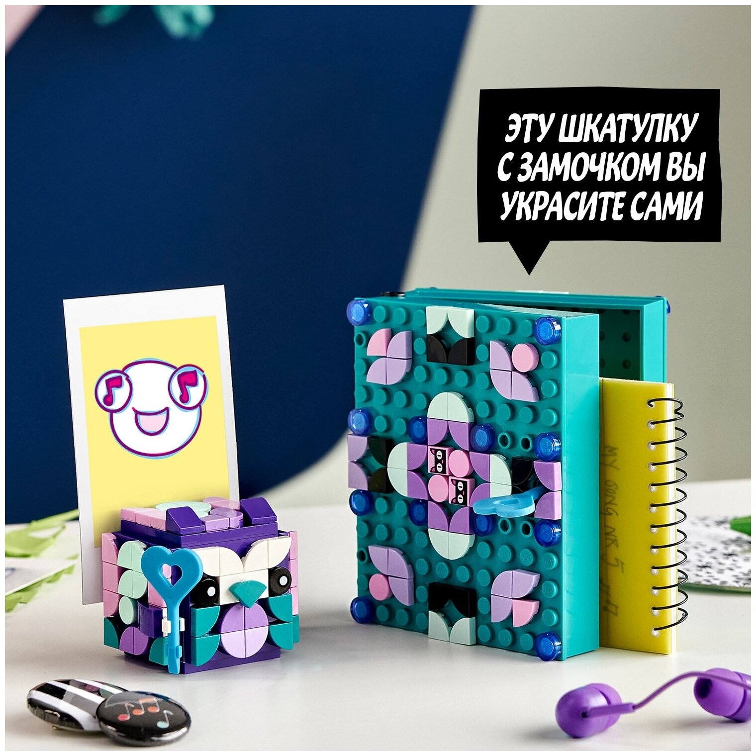 Наборы LEGO DOTS — это привлекательные поделки, которые дети создают и используют сами. Эта небольшая шкатулка-книжка, которую можно запереть н ключ, вдохновляет на открытое творчество, помогающее развивать фантазию и уверенность в себе.
