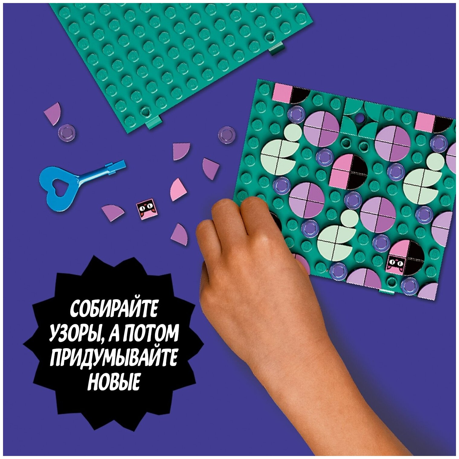 Плитки в наборе отлично подходят для создания уникальных узоров. Дети также могут использовать плитки из других комплектов и пакетов LEGO DOTS, — например, дополнительные элементы DOTS серии 3, — чтобы реализовать все свои идеи.
