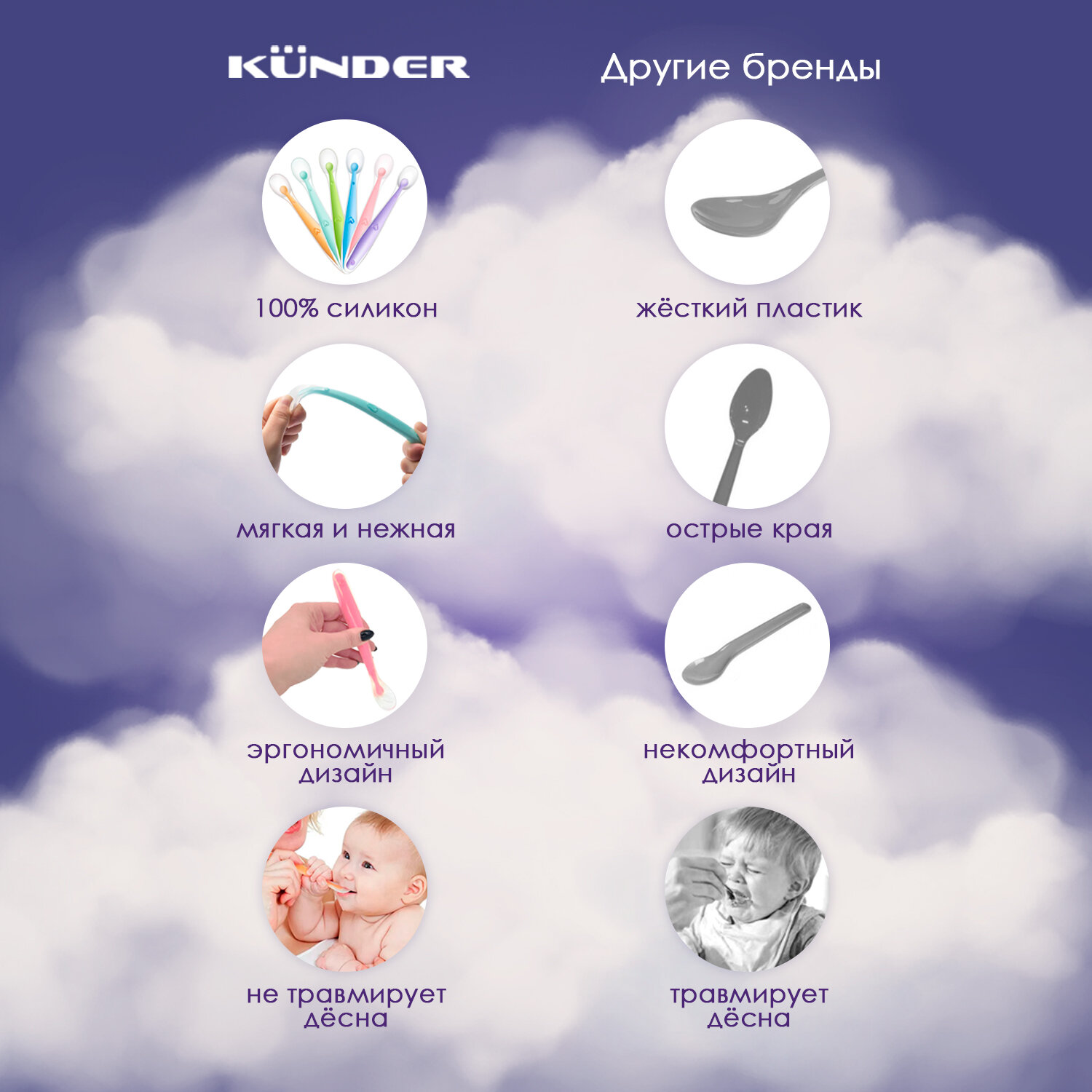 Детская ложечка от Kunder для первого прикорма с ультрамягким силиконом премиум качества гарантирует малышу положительные эмоции от его первых попыток есть самостоятельно и не повредит дёсна. Вес ложечки всего лишь 20 гр, что позволяет легко и удобно держать её в руках.