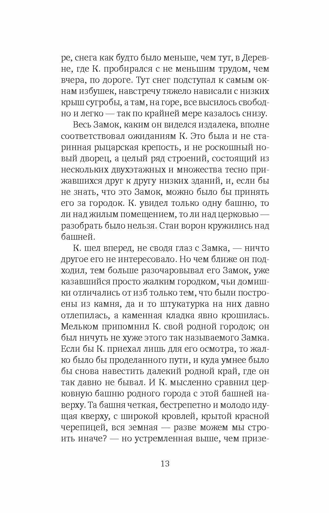 "Замок" читала в университетские годы, в этом же переводе, к которому, кажется, так и прикипела. Прекрасная и по-своему безумная, монументальная и насыщенная сложными идеями вещь, загадочная и при этом дотошная, мистическая и саркастически метафоричная... Мне никогда не казалось, что роман трудный, он, безусловно, большой (не в смысле количества страниц, а в... смысле :) ) , и незаконченный, это всё так. Но я слишком люблю такие тексты, немного напоминающие галлюцинации.