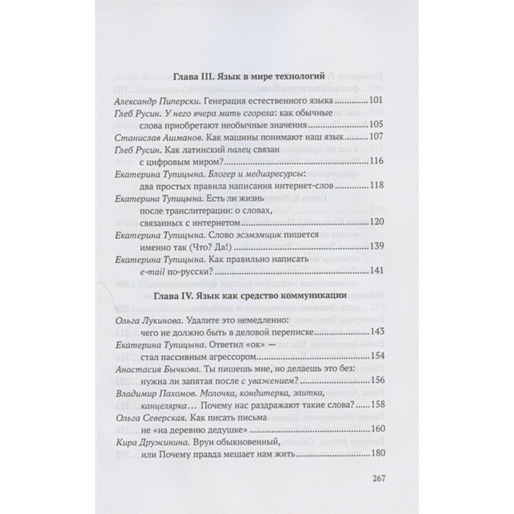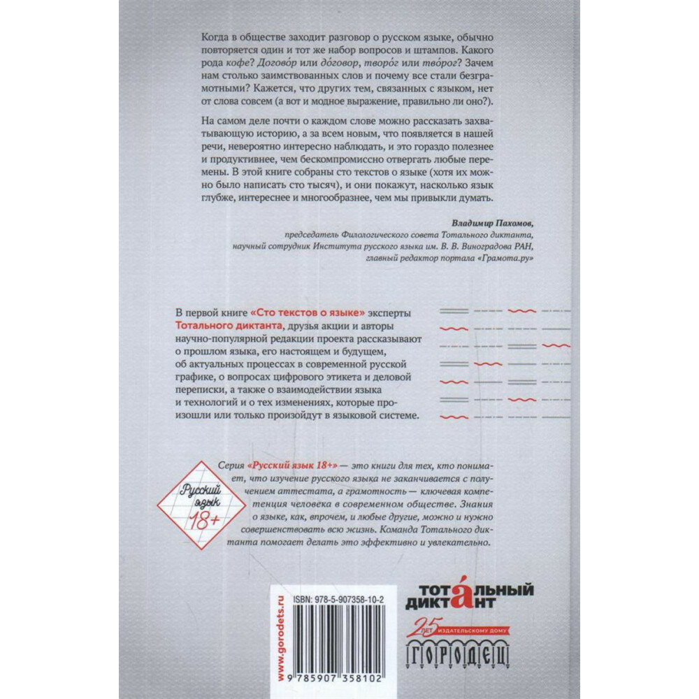 В первой книге «Cто текстов о языке» эксперты Тотального диктанта, друзья акции и авторы научно-популярной редакции проекта рассказывают о прошлом языка, его настоящем и будущем, об актуальных процессах в современной русской графике, о вопросах цифрового этикета и деловой переписки, а также взаимодействии языка и технологий и о тех изменениях, которые произошли или только произойдут в языковой системе.