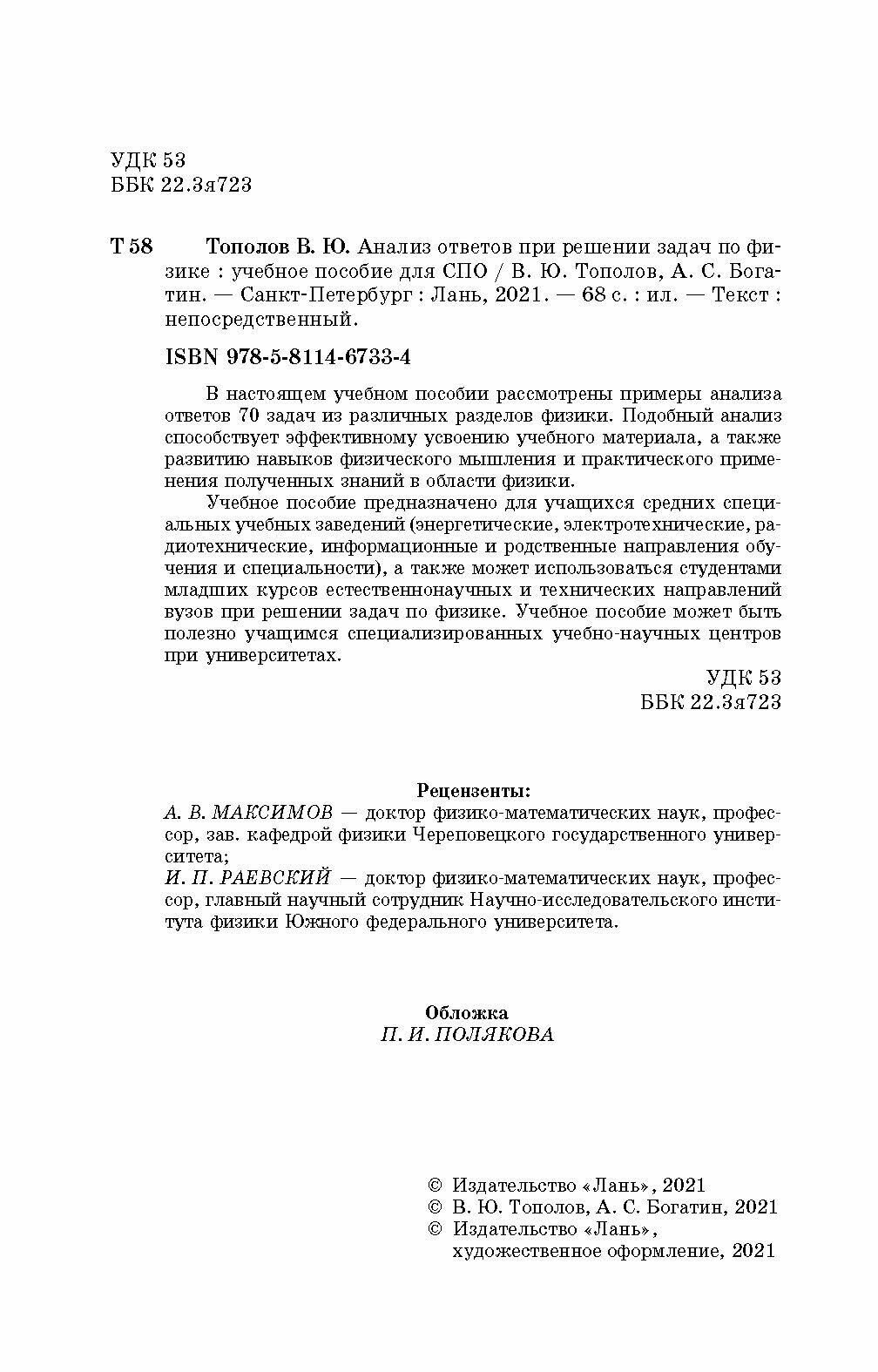 В настоящем учебном пособии рассмотрены примеры анализа ответов 70 задач из различных разделов физики. Подобный анализ способствует эффективному усвоению учебного материала, а также