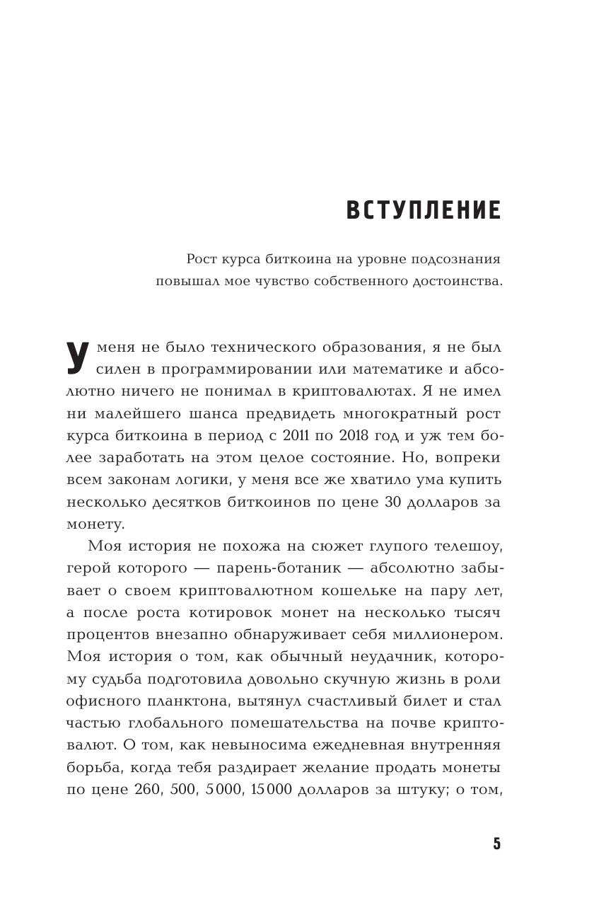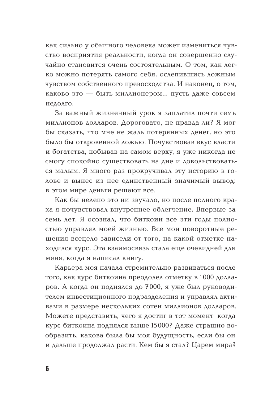 Прочла за три дня. Понравилась структура сюжета. Каждая глава привязана к стоимости биткойна и описывает переживания главного героя. Книга о том, как закомплексованный, алчный парень борется со своими «тараканами» в голове. «Тараканов» в книге действительно очень много. Сначала герой мне нравился , в середине книги вызывал отвращение, в конце книги – жалость и сопереживание. Прожила вместе с ним его историю. Концовка тоже великолепная – суровая реальность, чудес не бывает. Краткое описание героя: дорвался до власти, начал самоутверждаться, потерял все из-за своего упрямства.