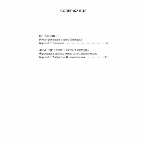 В книгу включены две знаменитые пьесы выдающегося Джорджа Бернарда Шоу, британского драматурга-новатора, основоположника (наряду с Ибсеном и Чеховым) интеллектуального театра ХХ века, лауреата Нобелевской премии по литературе и премии «Оскар». «Пигмалион» (1913) – история лондонского профессора фонетики Генри Хиггинса, «сотворившего» из уличной цветочницы светскую леди, и одновременно история цветочницы Элизы Дулиттл, заставившей Хиггинса увидеть в ней не просто материал для интересного эксперимента, а живого человека, – стал основой известнейшего мюзикла «Моя прекрасная леди» (1956) и его оскароносной экранизации (1964) с Рексом Харрисоном и Одри Хепбёрн в главных ролях. В «Доме, где разбиваются сердца» (1913–1917) причудливый дом-корабль, где гости ведут непрерывные и бесплодные споры о любви и смысле жизни под аккомпанемент свистов и криков хозяина, мудреца и безумца капитана Шотовера, постепенно вырастает в символический образ старого мира, вступившего в новый век и стоящего на пороге гибели.