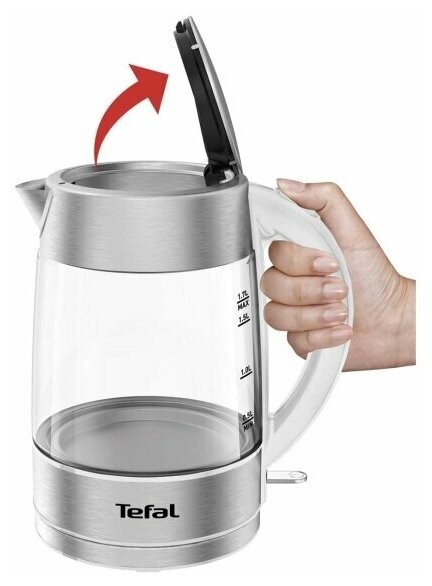 Стеклянный чайник Tefal с элементами из нержавеющей стали. Элегантный чайник Tefal выполнен из прочного термостойкого стекла, которое выдерживает резкие перепады температуры и гарантирует долгую службу устройства. Материал не влияет на вкус воды и на 100% пригоден для переработки. Чайник с полностью прозрачным корпусом и эффектной подсветкой впишется в интерьер любой кухни. Крышка легко открывается нажатием на кнопку для удобного наполнения и очистки чайника. Фильтр задерживает частицы накипи, когда вы наливаете горячую воду в заварочный чайник или чашку. Кнопка включения с подсветкой и автоматическим отключением. Чайник можно поворачивать на 360 и брать с любой стороны.