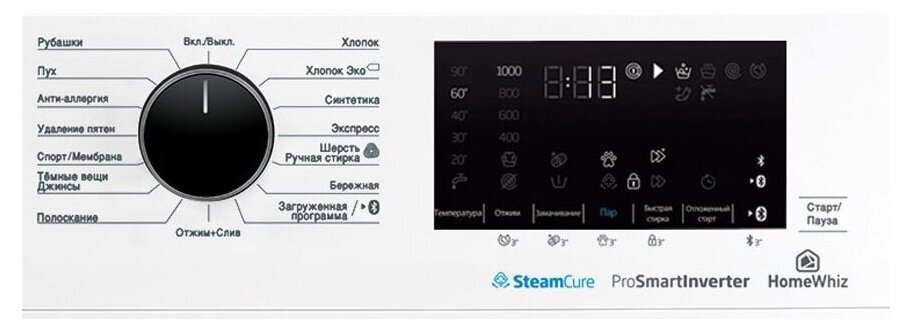 | Программы | стирка деликатных тканей, экономичная стирка, стирка джинсов, стирка черных вещей, стирка спортивной одежды, стирка пуховых вещей, супер-полоскание, быстрая стирка, замачивание, программа удаления пятен, подача пара |