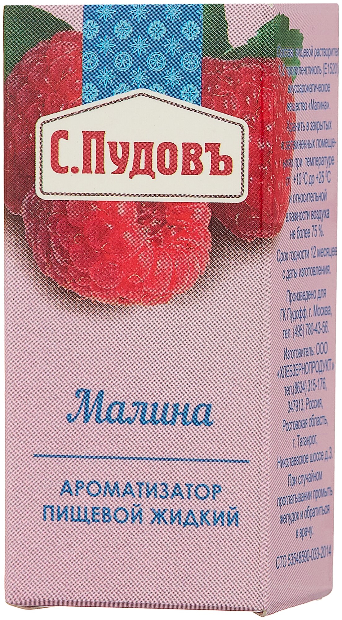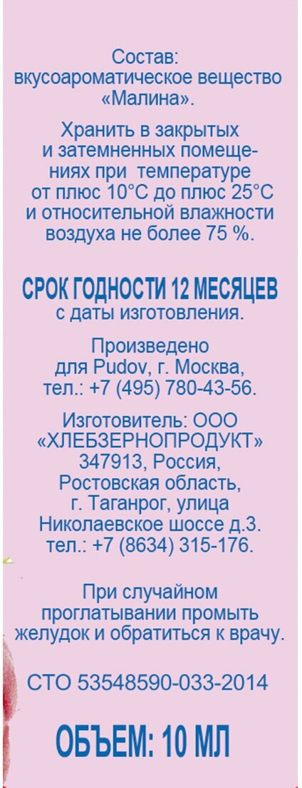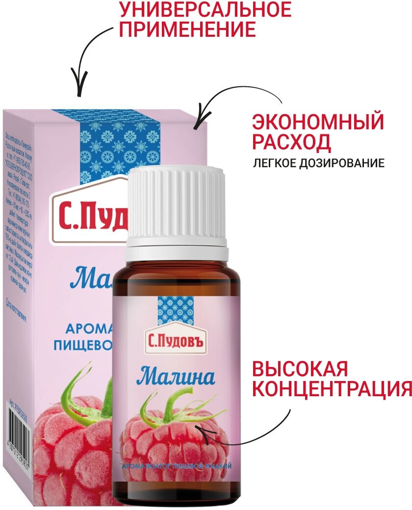 Ароматизаторы «С. Пудовъ» отличаются высокой стабильностью и интенсивностью.Кроме напитков и еды, ароматизаторы прекрасно подходят для мыловарения, изготовления слаймов и свечей.Оцените сладкий аромат спелой и сочной ягоды малины!Насыщенный узнаваемый ягодный букет прекрасно передает жидкий пищевой ароматизатор идентичный натуральному «Малина». Ароматизаторы «С. Пудовъ» прекрасно подходят для того, чтобы усилить или придать аромат выпечке, десертам, напиткам.Удобный пузырёк с капельным дозатором позволяет легко контролировать добавление необходимого количество ароматизатора. Достаточно 2-3 капли на 500 грамм теста, крема или жидкости. Рекомендуется тщательно перемешать для равномерного распределения ароматизатора.Вкусоароматические вещества, которые мы используем для производства наших ароматизаторов, признаны безопасными и одобрены для использования в пищевой промышленности Таможенного союза.Наполните жизнь яркими и запоминающими ароматами!Рекомендации по применению: 2-3 капли ароматизатора на 500 г теста, крема или жидкости. Тщательно перемешайте для равномерного распределения ароматизатора.В составе ароматизаторов используются душистые вещества, входящие в международные списки веществ (FEMA), общепризнанные как безопасные и разрешенные для использования в пищевой промышленности в Таможенном союзе на основании ТР ТС 029/2012, а также натуральные эфирные масла и олеорезины. Растворителем в ароматизаторах является пищевой растворитель 1,2-пропиленгликоль (Е1520).Срок годности: 12 месяцев. Хранить в закрытых и затемненных помещениях при температуре от +10 оС до +25 оС и относительной влажности воздуха не более 75%.