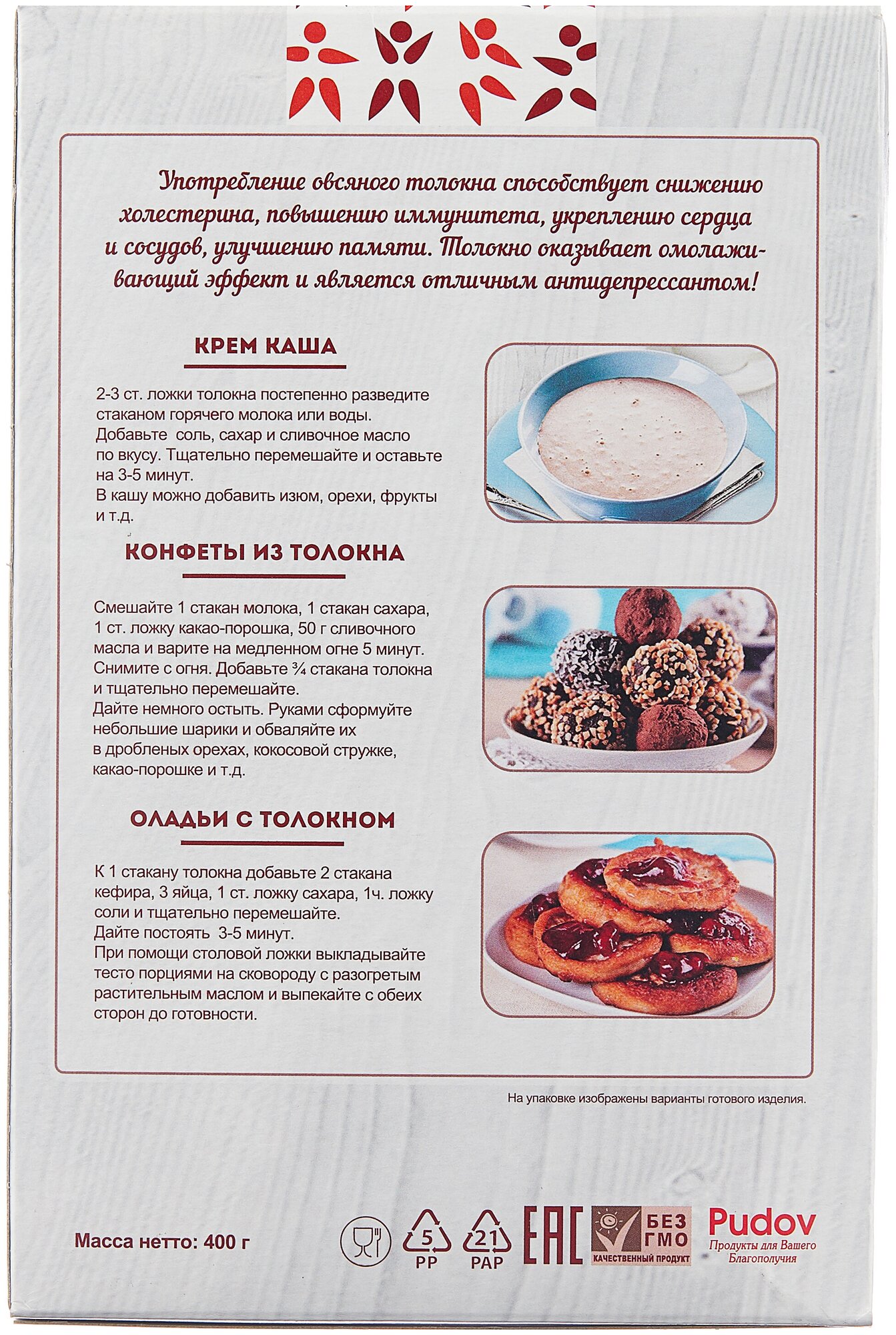 Овсяное толокно не зря называют нашим родным супер-фудом. Это питательный и вкусный продукт, который при регулярном потреблении улучшает работу сердечно-сосудистой системы, ЖКТ, омолаживает организм и поддерживает хорошее настроение. Все благодаря бережному производству продукта.Толокно овсяное «С. Пудовъ» изготовлено по технологии, которой когда-то пользовались и наши предки. Отборные зёрна овса сначала вымачивают, затем бережно высушивают и обжаривают при низких температурах. После этого овёс толкут (отсюда и название – толокно), а не мелят, как при производстве традиционной муки. Ещё одно важное отличие – у зерна для обычной муки удаляется оболочка, а у толокна она сохраняется. Отсюда его полезные свойства. Толокно богато витаминами и микроэлементами, содержит клетчатку, отличается высокопитательными свойствами.Наши предки говорили про толокно «Замеси да на стол неси!» Это означает, что готовое толокно не требует хитрых рецептов приготовления, его не нужно варить, достаточно залить горячей водой или молоком. Экономия времени – вот главное преимущество без ущерба пользе.В готовую нежную и ароматную кашу можно добавить любимые фрукты или варенье - сплошная польза на вашем столе!Овсяное толокно может служить основой для сладостей в рецептах правильного питания.Состав: толокно овсяное. Может содержать следы глютена, сои, молока, яиц, орехов, арахиса, кунжута, сельдерея, горчицы.Пищевая ценность на 100 г продукта(средние значения): белки - 12,0 г, жиры - 6,0 г, углеводы - 60,0 г.Энергетическая ценность/калорийность - 1420 кДж/340 ккалСрок годности: 10 месяцев. Хранить при температуре 20±5 оС и относительной влажности воздуха не более 70%.