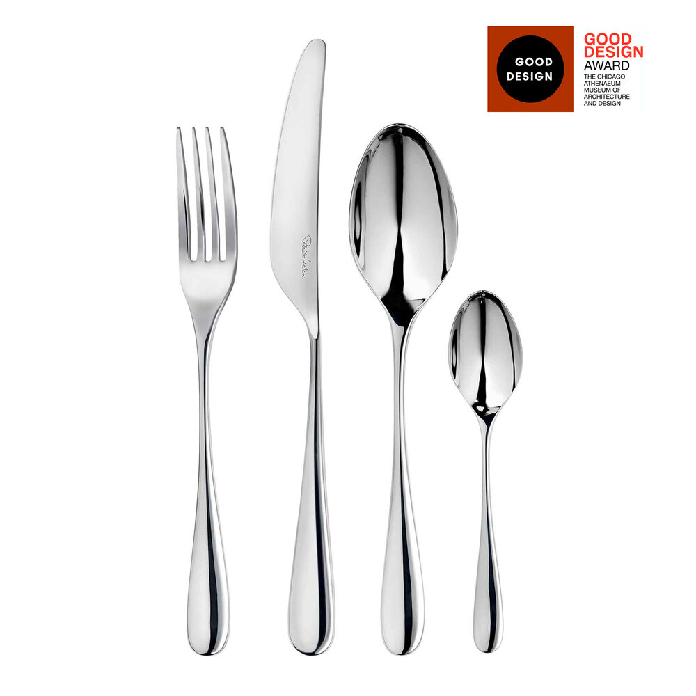 Серия вобрала в себя все идеи и чаяния английского дизайнера. Удивительно обтекаемая форма этих столовых приборов поражает с первого взгляда. Утонченная ножка ложек, вилок и ножей плавно перетекает в верхнюю часть, создавая эффект легкости и изящности. Посуда изготовлена из первоклассной нержавеющей стали, закалена в особых условиях и отполирована до зеркального блеска. На каждый прибор нанесен вензель производителя Robert Welch.