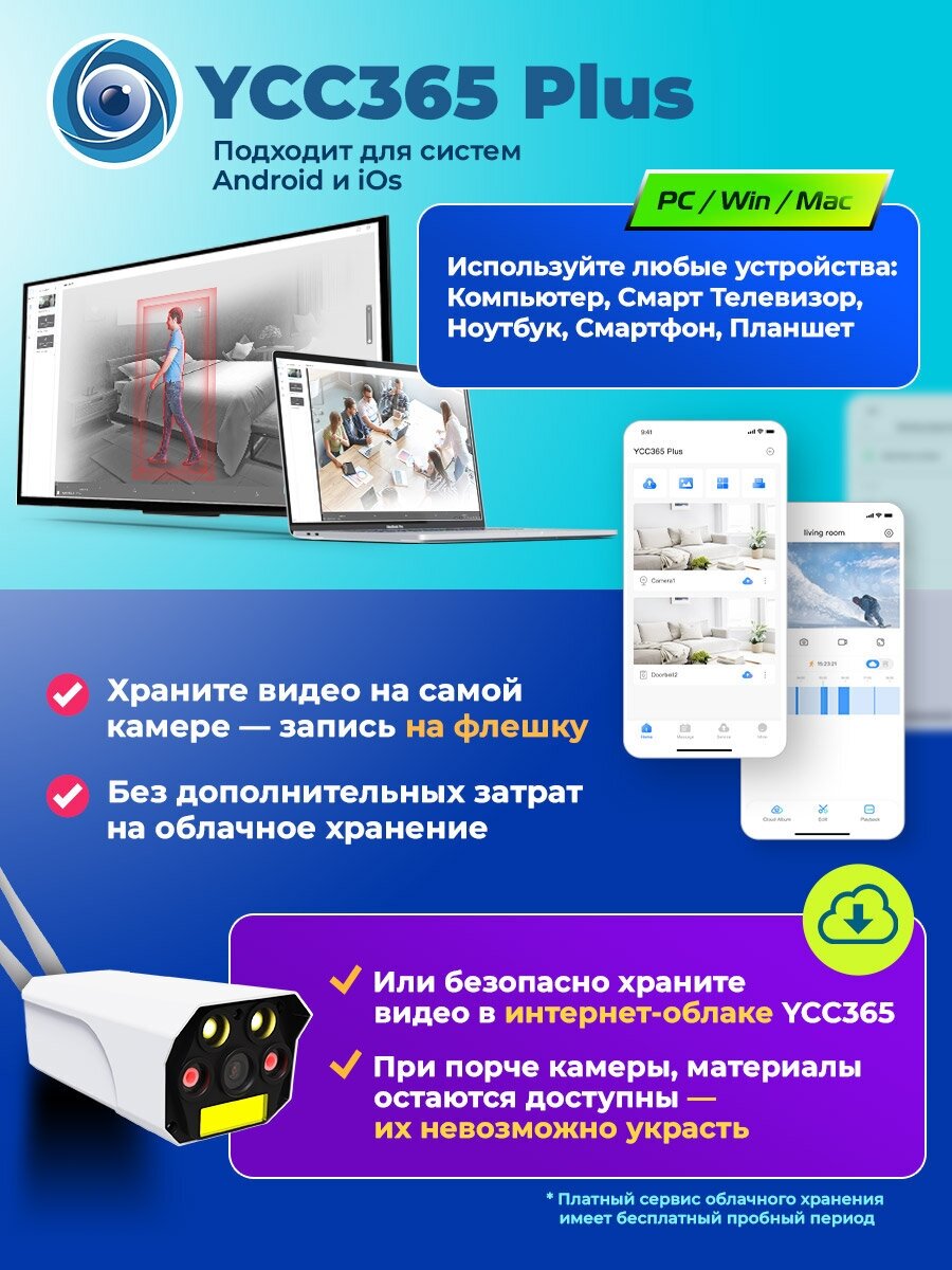 | Установив бесплатное приложение YCC365 Plus и зарегистрировав в нём учетную запись и Вашу камеру, Вы получите простой и удобный доступ к удаленному управлению Wi-Fi камерой со смартфона или планшета | подключение к трансляции в реальном режиме времени, приближение деталей изображения, просмотр ранее записанных на карту памяти видео, получение тревожных уведомлений при обнаружении движения. |