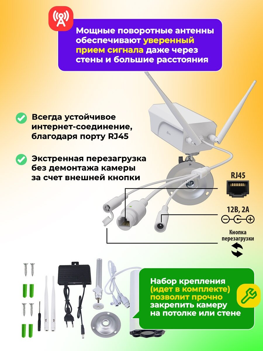 Простота установки. Комплект - всё включено - подключил-забыл. Справится с установкой даже ребёнок. Эту камеру настроил за 5 минут и уехал. Камера имеет динамик и микрофон, свой облачный сервис. Возможность подключить к интернету от модема (без белого ip адреса). Не нужно покупать HDD диск и видеорегистратор, можно вставить карту micro SD и записывать на неё. Просмотр в реальном времени через приложение. Ловит антенна примерно 30м. В подарок идёт блок питания. Также понравилось наличие LED пр...