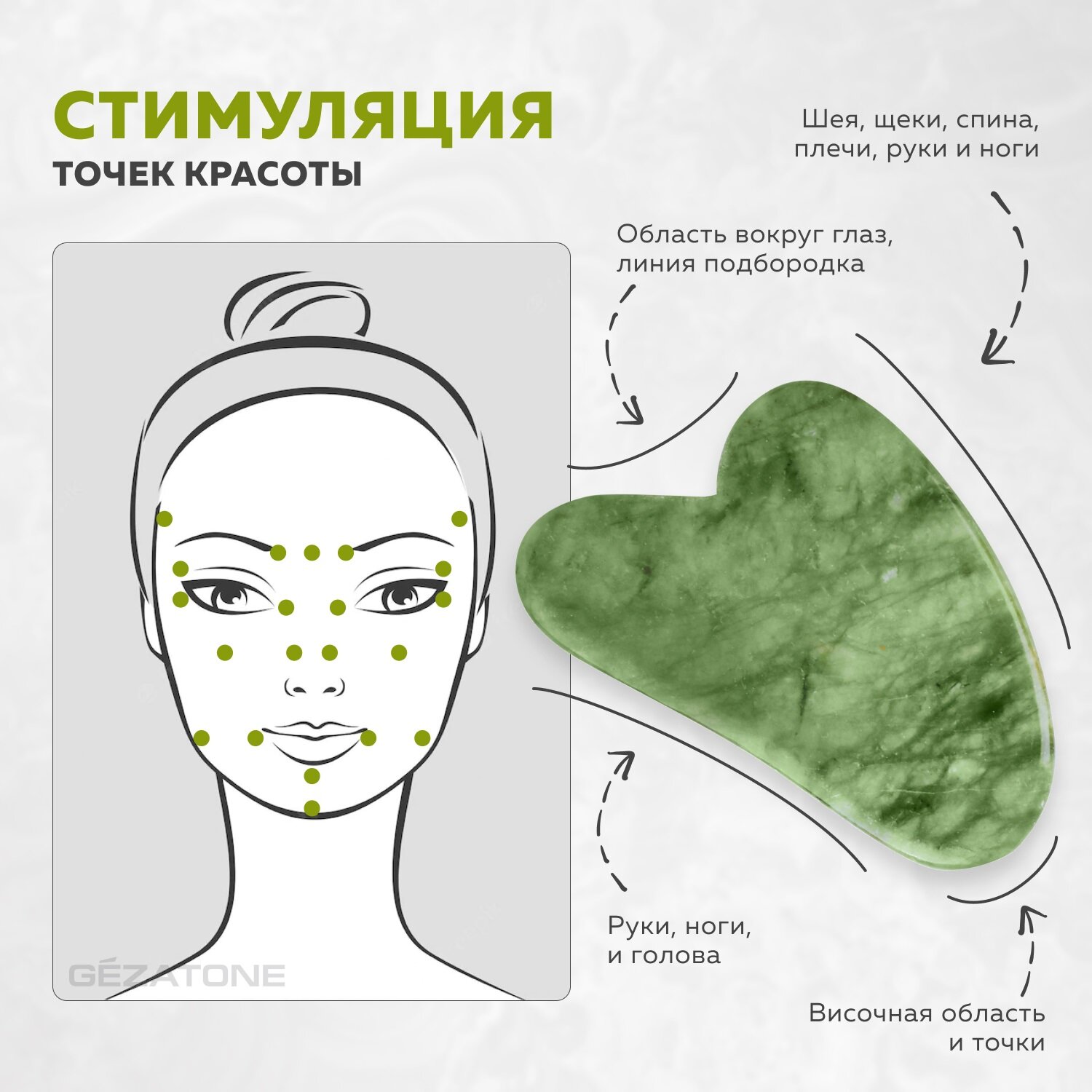- Выпуклая и вогнутая стороны кристалла гуаша применяют для работы с крупными зонами лица, для укрепления овала, для воздействия на шею, руки, плечи, ноги. Острым концом стимулируют «точки красоты».