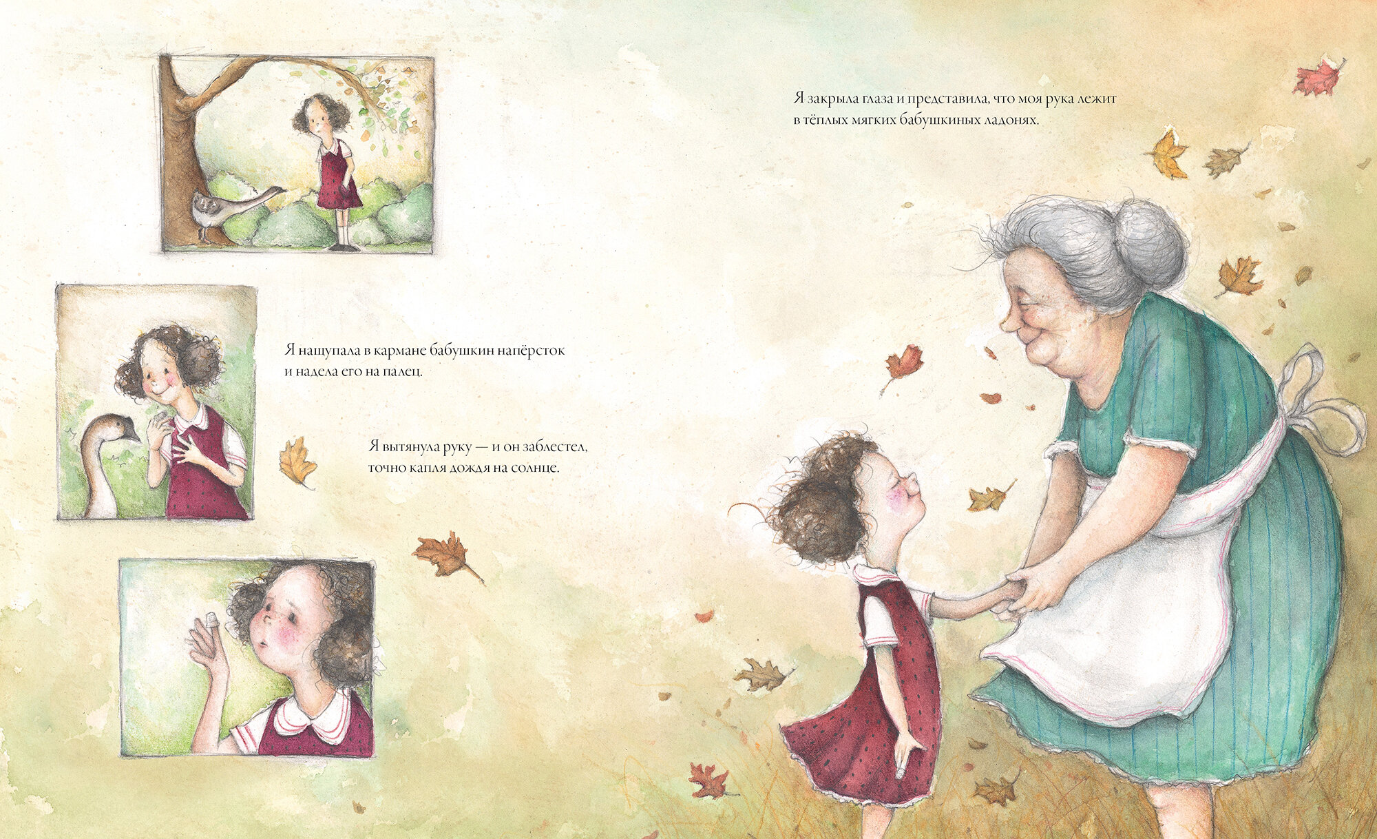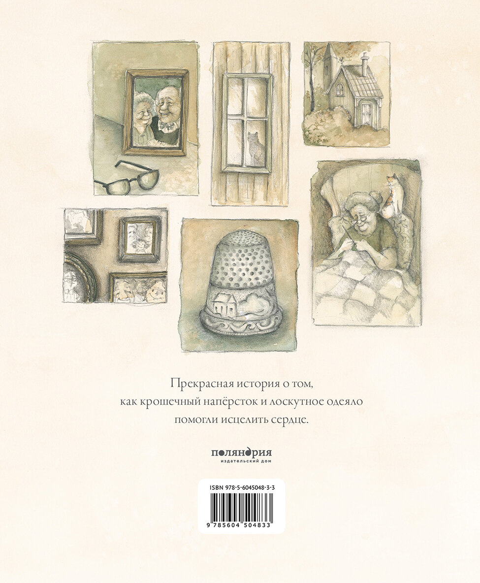 Чудесная, такая душевная, теплая книга о бабушке, которой уже нет рядом. Трогательный рассказ, хочется обнять свою бабушку, почувствовать запах ее пирожков, укрыться ее теплыми историями…Навивает на мысли и воспоминания. Акварельный воздушные иллюстрации, чудесно дополняют и согревают эту историю. Уютный день, девочка, мама и дедушка …. и конечно бабушка и ее наперсток.