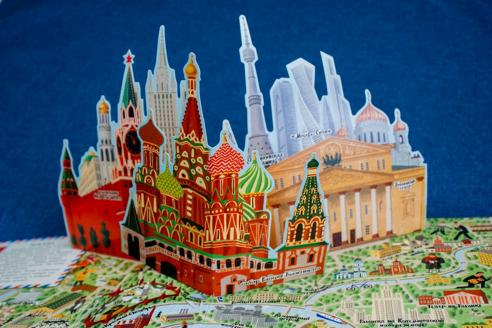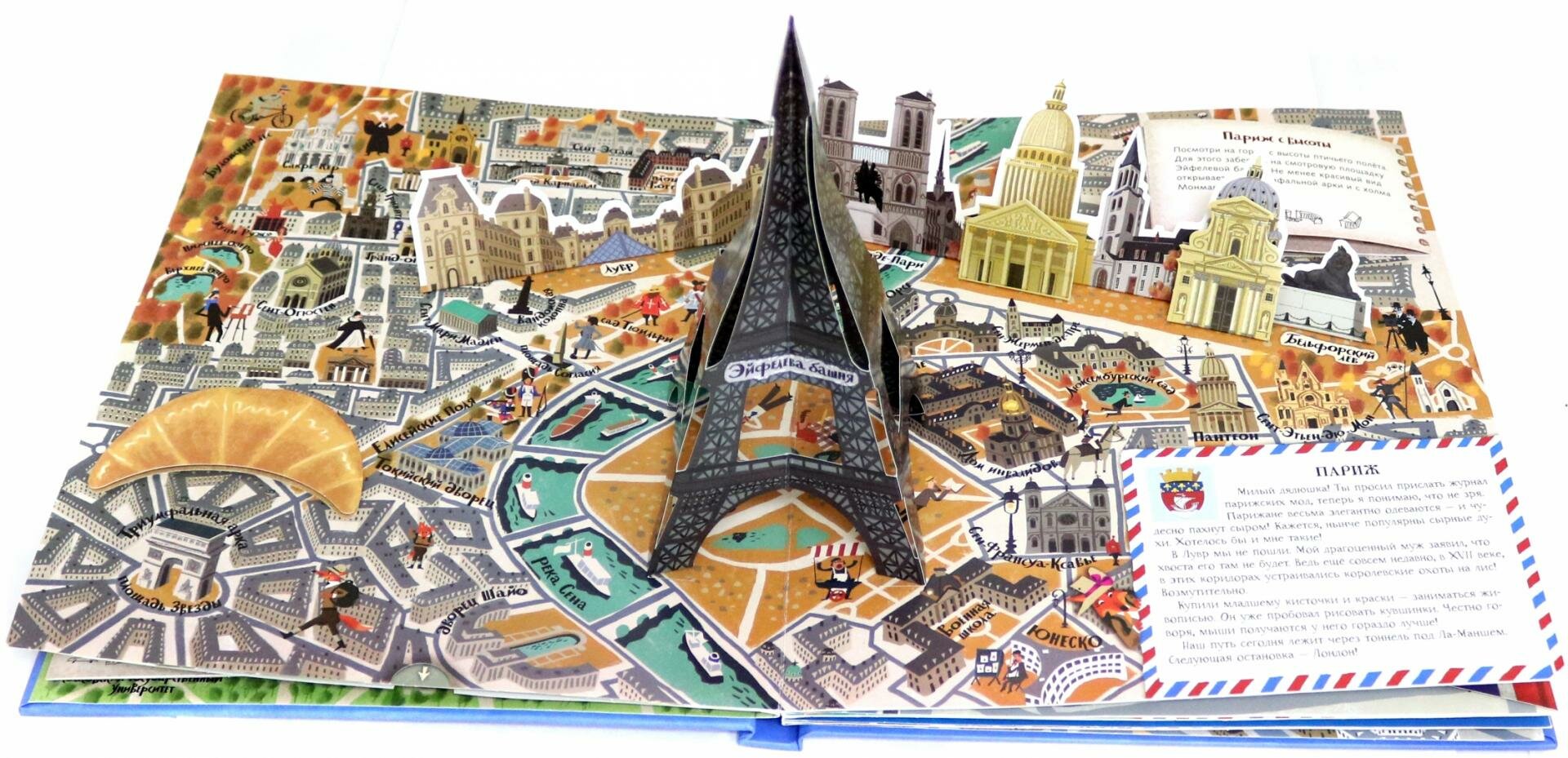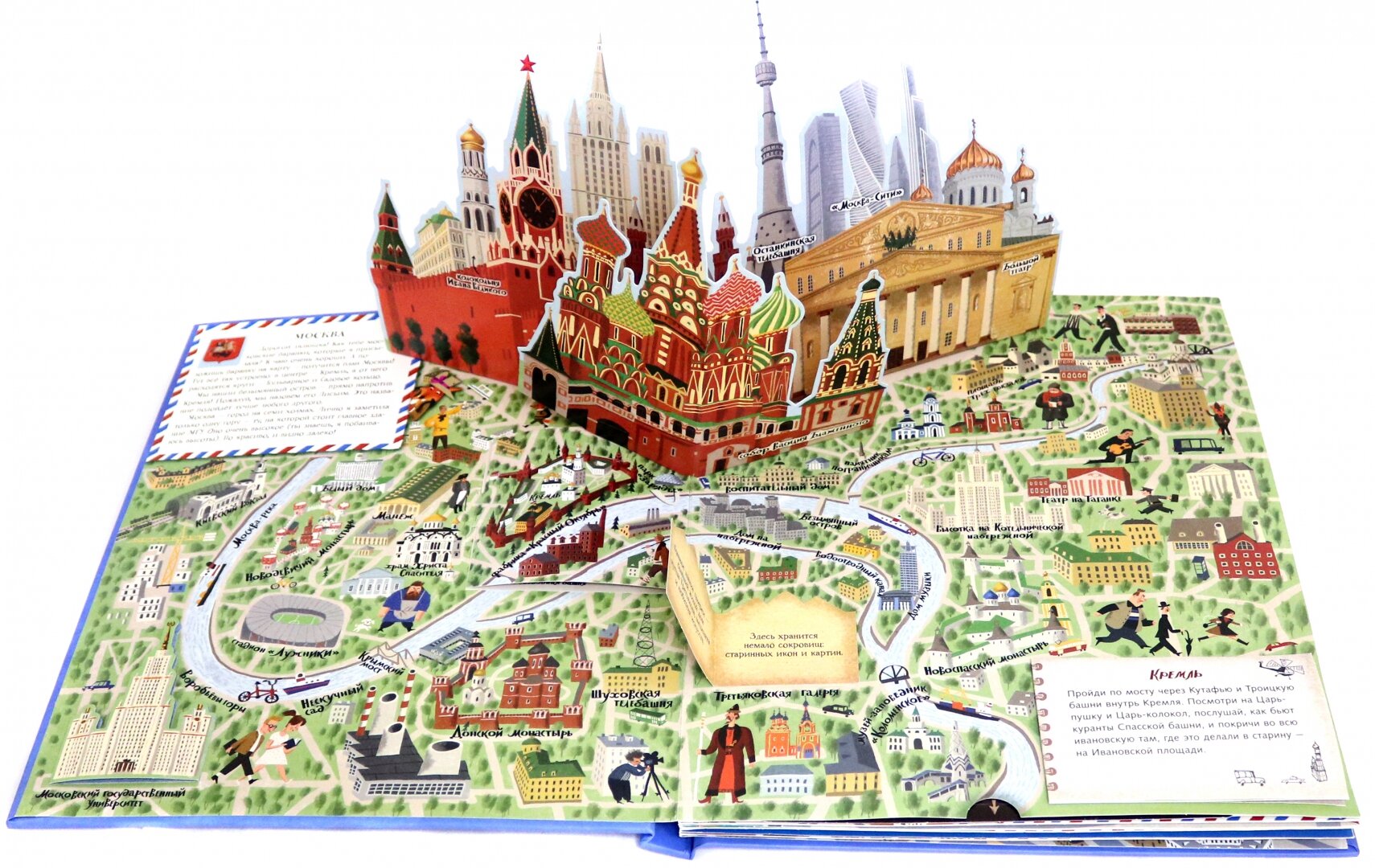 В книге затронуты семь городов (Москва, Париж, Лондом, Венеция, Барселона, Нью-Йорк, Санкт-Петербург). На каждый город выделено по развороту и на каждом развороте есть сюрприз: встает объемный бумажный макет главной достопримечательности, двигаются детальки или раскладываются карты.