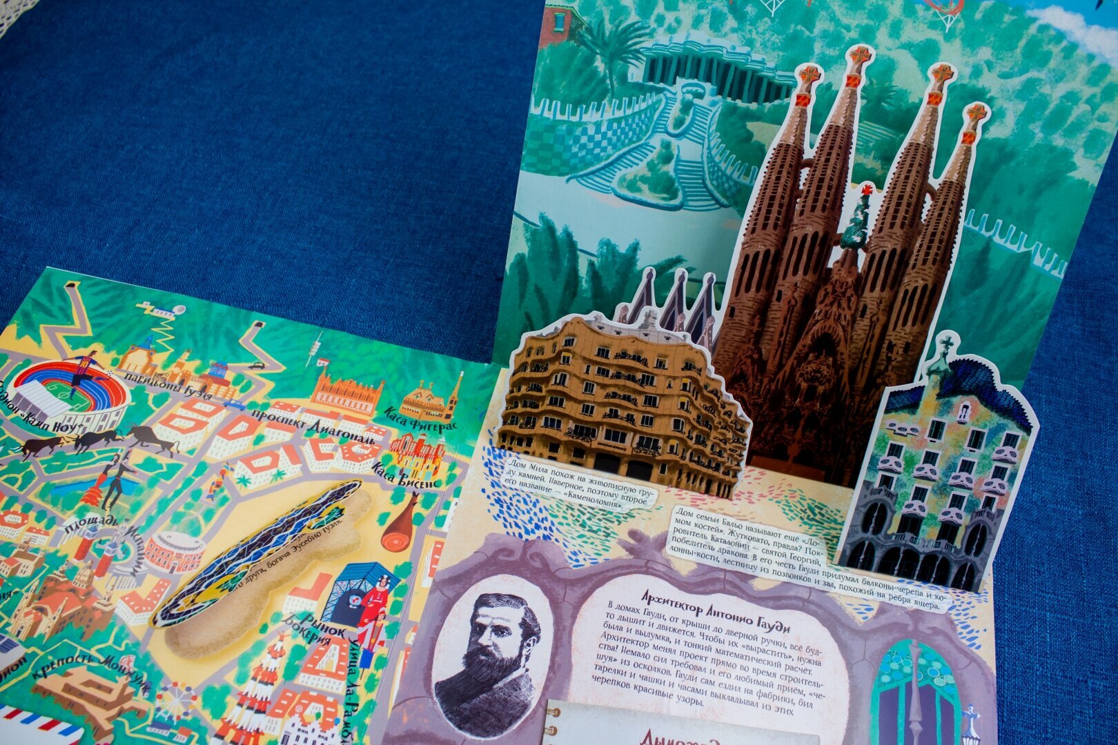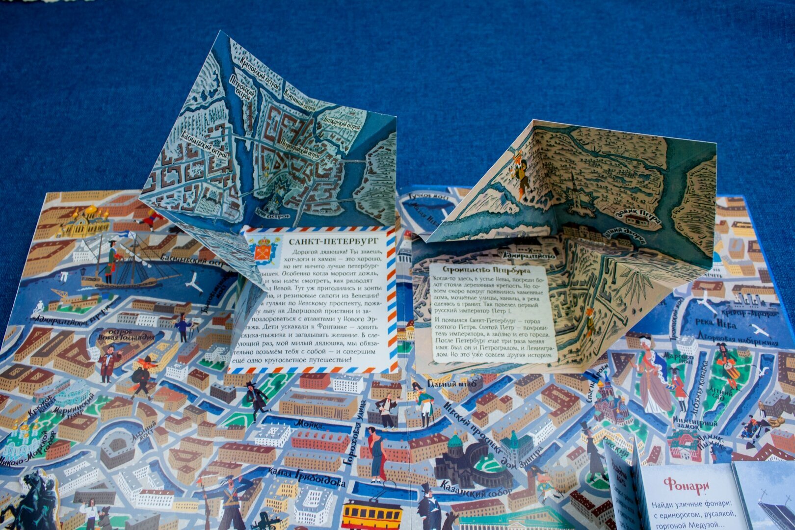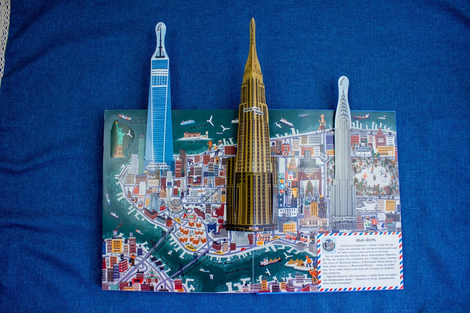 В книге затронуты семь городов (Москва, Париж, Лондом, Венеция, Барселона, Нью-Йорк, Санкт-Петербург). На каждый город выделено по развороту и на каждом развороте есть сюрприз: встает объемный бумажный макет главной достопримечательности, двигаются детальки или раскладываются карты.