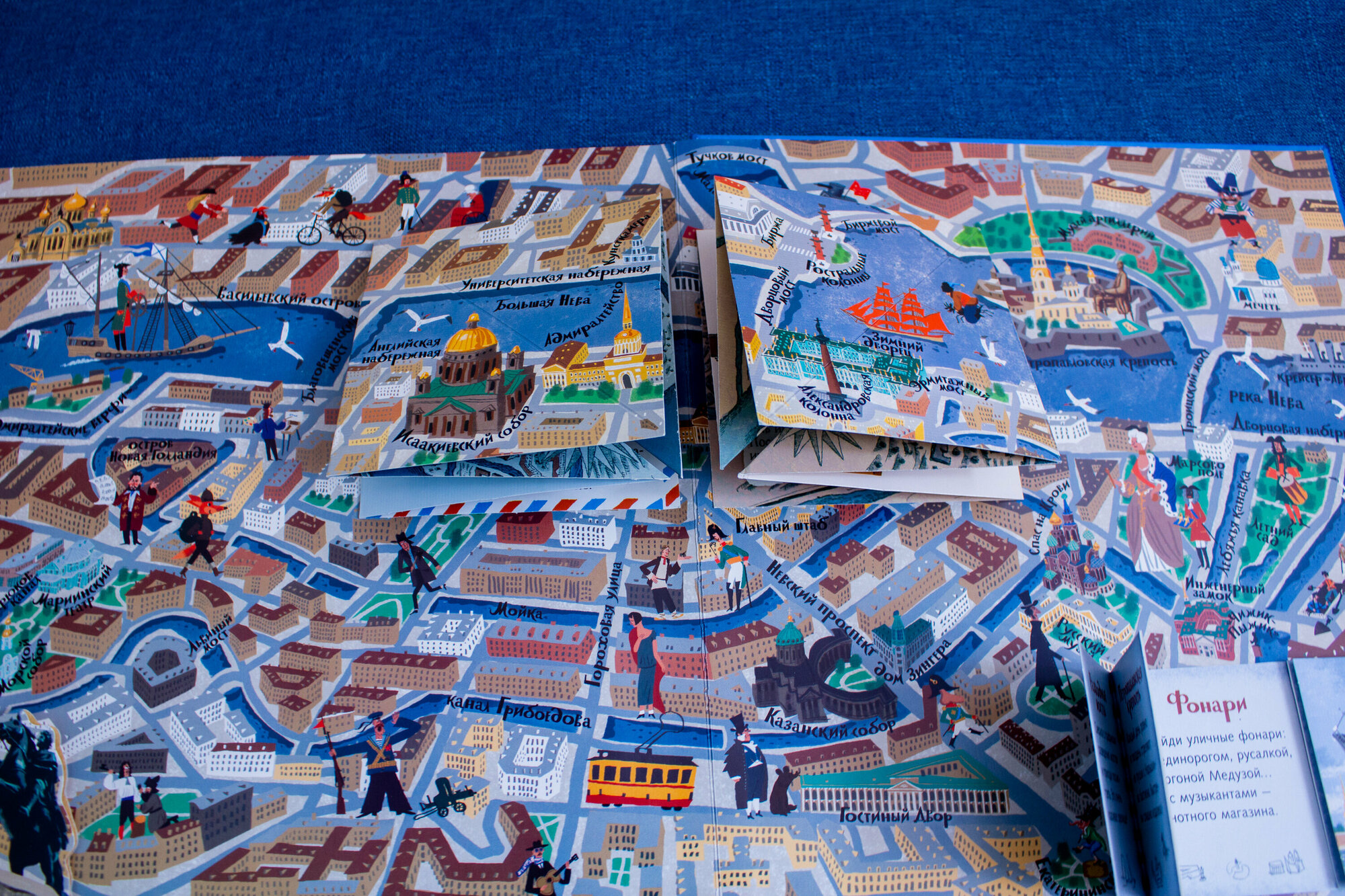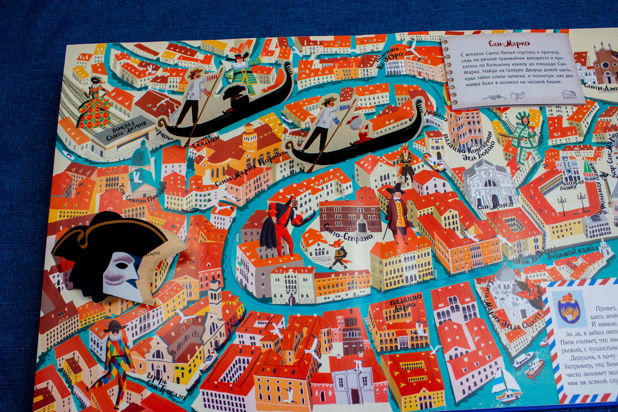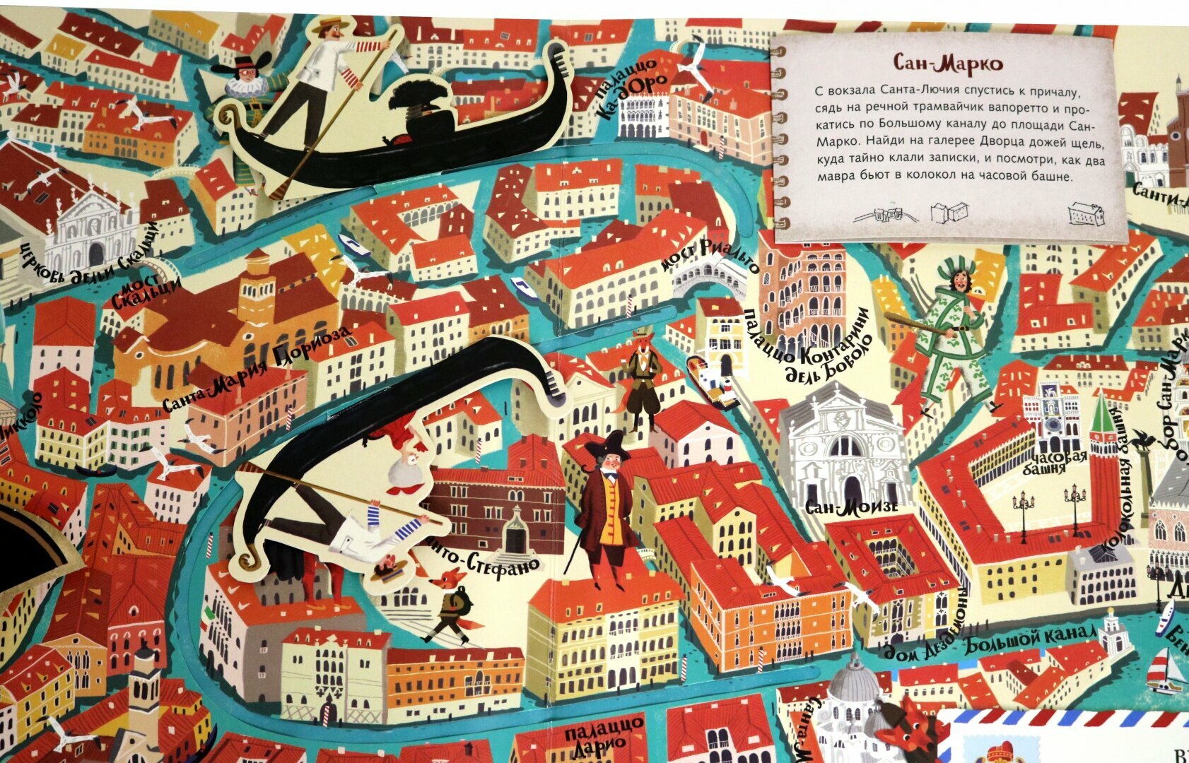 Книга вцелом очень приятная, крупная, с большим количеством мелких деталей. Текста не очень много, на каждой странице письмо лиса-путешественника своему дедушки из конкретного города и пара фактов и рекомендаций, что посмотреть в этом городе.