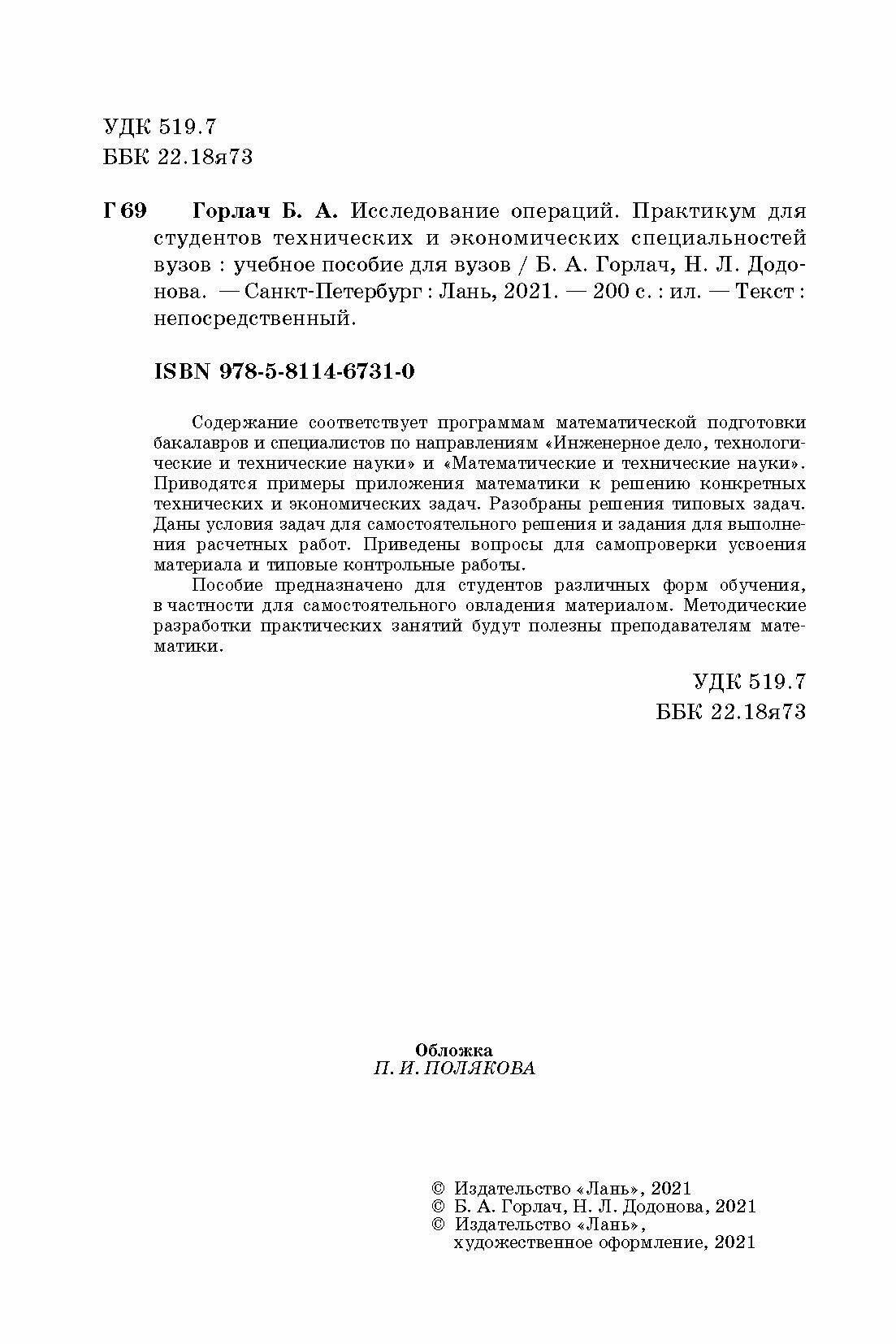 Исследование операций.Практ.д/техн.и экономич.спец (Горлач Борис Алексеевич, Додонова Наталья Леонидовна); Лань, 2021