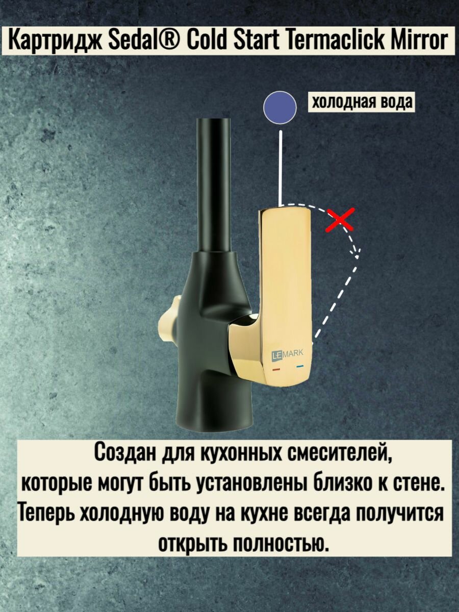 Комбинированный аэратор Neoperl® Perlator® Honeycomb® Flow Thru для водопроводной и питьевой воды. Керамический картридж Sedal® Cold Start Termaclick Mirror 35 мм. Для крана с питьевой водой: кран-букса с керамическими пластинами (угол поворота - 90⁰). Гибкая подводка 1/2" 60 см. Присоединительная группа для настольного крепления. Переходник для подключения шланга от фильтра с питьевой водой. Металлические рукоятки. Материал латунь