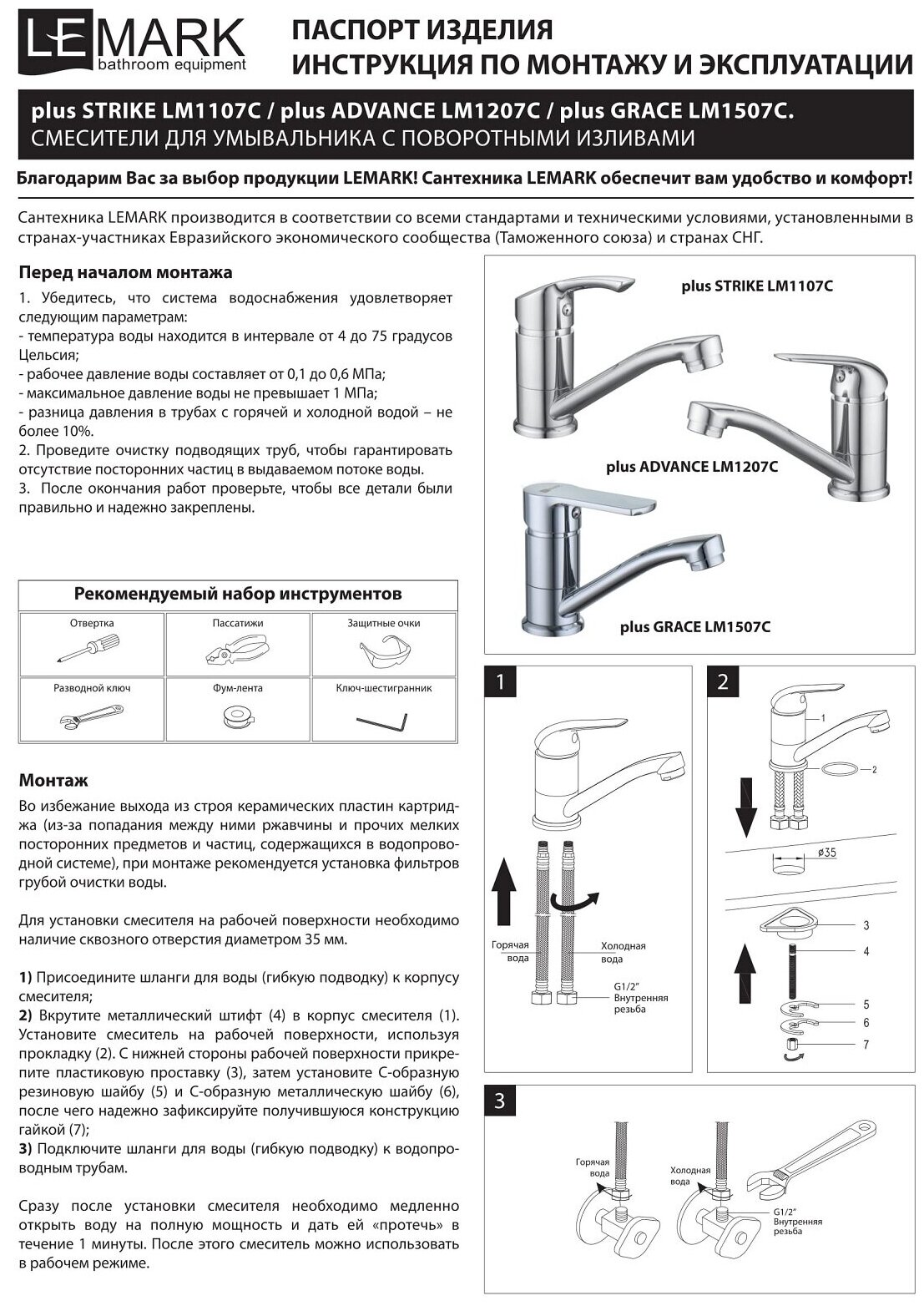 | ВКоробке | Смеситель - 1 шт. Комплект подводки - 1 шт. Набор креплений - 1 шт. Инструкция - 1 шт. |