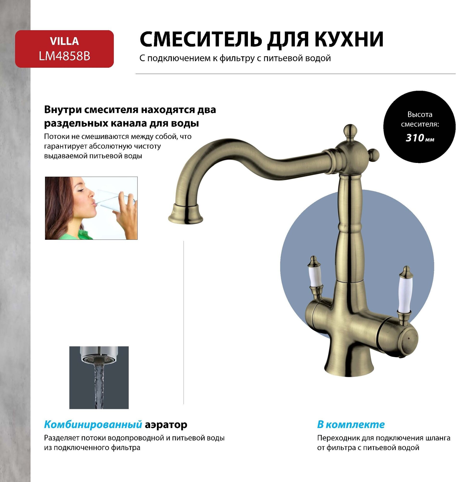 Серия VILLA - благородное обаяние вечных ценностей. Комплектация: Комбинированный аэратор Neoperl® для водопроводной и питьевой воды Керамический картридж 35 мм Кран-букса с керамическими пластинами (угол поворота - 90?) для крана с питьевой водой Металлические рукоятки с керамическими вставками Гибкая подводка 1/2 60 см Переходник для подключения шланга от фильтра с питьевой водой