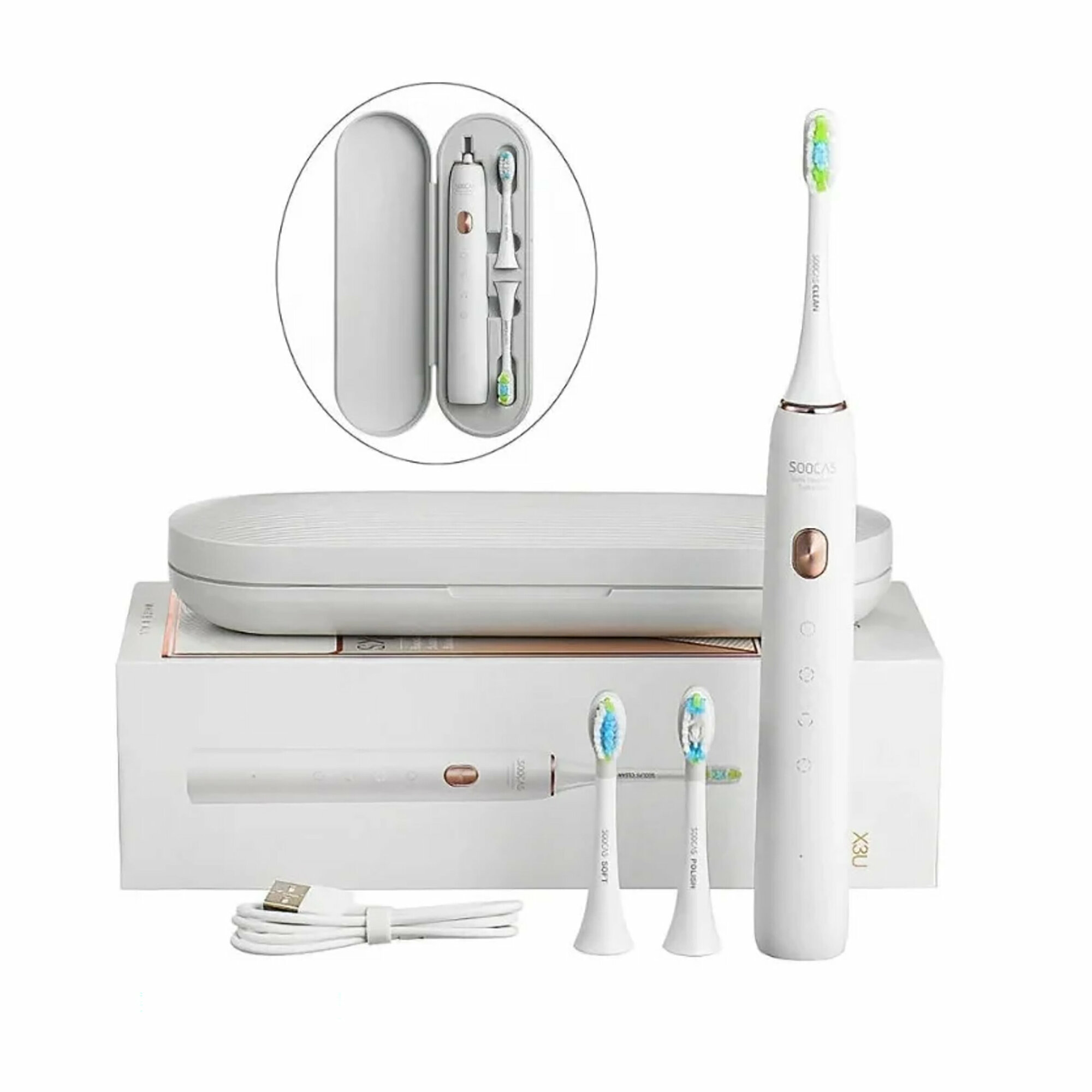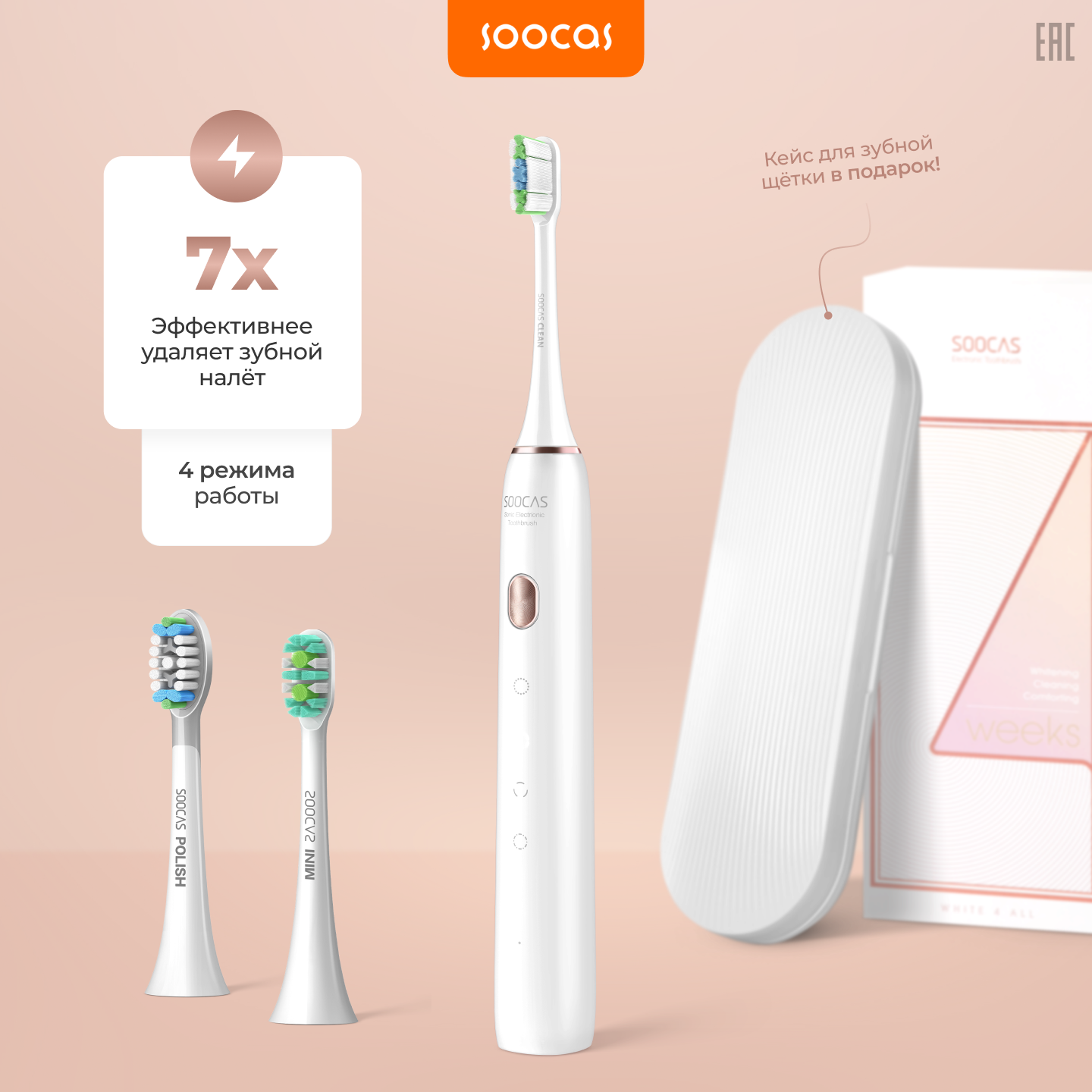 Электрическая зубная щетка SOOCAS X3U ? прибор для удобства гигиены полости рта, выполненный в черном корпусе. Основой работы устройства является технология звуковых колебаний, которые при включении щетки передаются на щетинки. Высокая частота вибраций щетинок ? до 39600 раз в минуту обеспечивает максимально эффективную чистку. Модель предусматривает 4 режима чистки, что делает устройство идеальным приспособлением для каждого члена семьи: Это режимы деликатной чистки, отбеливания, массажа, а также щадящий режим. SOOCAS X3U получает питание от аккумулятора Li-ion, который позволяет использовать щетку в течение 25 дней при чистке два раза в день по 2 мин. Привыкнуть к щетке помогает функция привыкания. Датчик нажима обеспечивает бережную чистку: при чрезмерном нажатии срабатывает индикация. Модель использует 3 типа насадки, включенные в комплект. Для ежедневной чистки применяется насадка с щетинками средней жесткости. Отбеливающая насадка позволяет привести порядок зубы тем, кто много употребляет кофе и курит, а насадка для чувствительных зубов обеспечивает бережный уход.