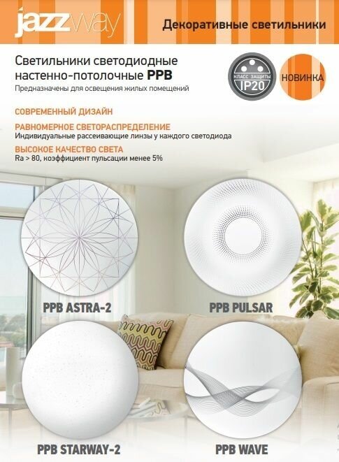 Jazzway PPB Pulsar 36w 4000K IP20 D380*65Светильники PPB крепятся непосредственно на опорную поверхность. Срок службы светодиодов люстры 25 000 часов. Способ крепления накладной. Крепеж входит в комплект поставки. Плафоны светильников украшены декоративными принтами. Металлический корпус, плафон из ПВХ. Встроенный драйвер входит в комплект поставки. Светильники не диммируются.