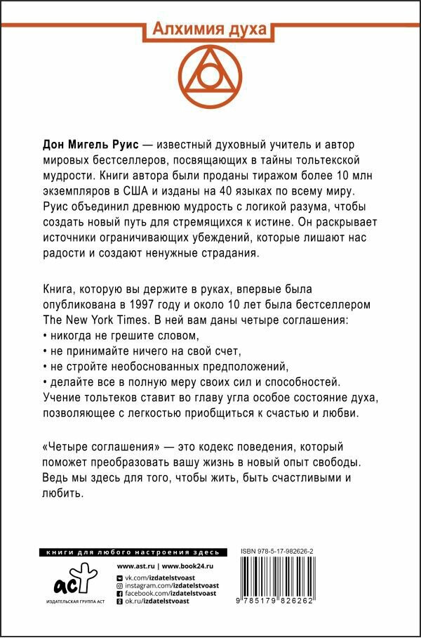 Книга, которую вы держите в руках, впервые была опубликована в 1997 году и около 10 лет была бестселлером The New York Times. В ней вам даны четыре соглашения: никогда не грешите словом, не принимайте ничего на свой счет, не стройте необоснованных предположений, делайте все в полную меру своих сил и способностей.