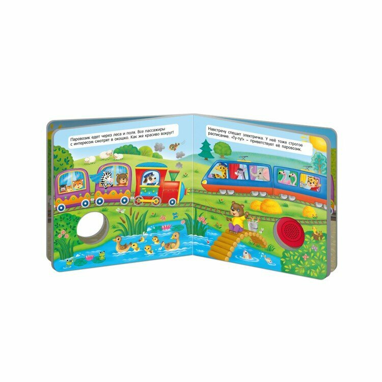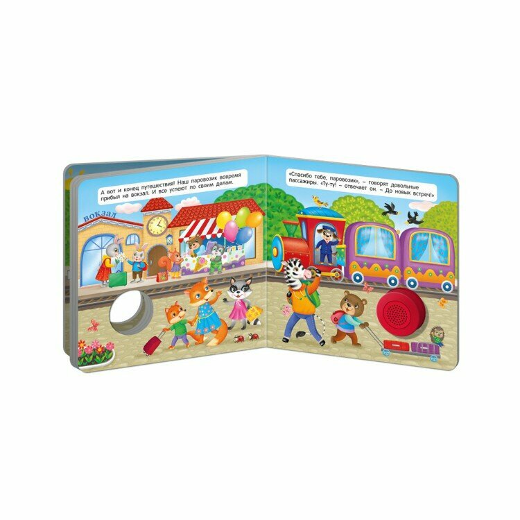 Яркие цвета, много рисунков, качественные толстые страницы из картона и еще бонус в виде гудка паровоза - мой сын в восторге!)) теперь, когда слышит настоящий поезд за окном, всегда к нему несется и кричит «ту-ту!».