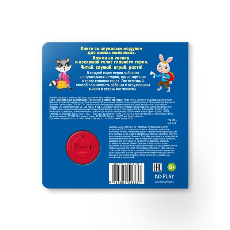 Звуковая книга "Веселый паровозик" для самых маленьких читателей. В каждой книге серии своя забавная и поучительная история, яркие картинки с изображением веселых и добрых героев и музыкальный модуль с голосом главного героя. Это отличный способ познакомить ребенка с окружающим миром и увлечь его чтением. Малыш будет с удовольствием рассматривать яркие страницы и читать историю главных героев книги. Книжка сделана из плотного картона с глянцевой ламинацией, поэтому родители могут не опасаться, что ребёнок порвёт странички. Благодаря компактному формату (15,5х15,5 см) её удобно брать с собой в дорогу. Книжка укомплектована батарейками. Одна кнопка - один звук.